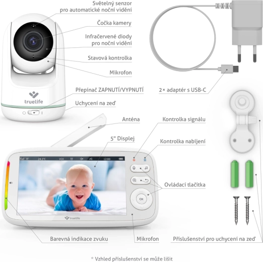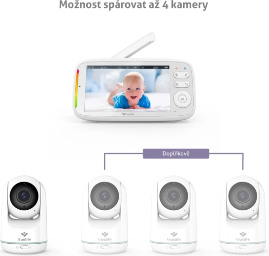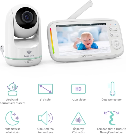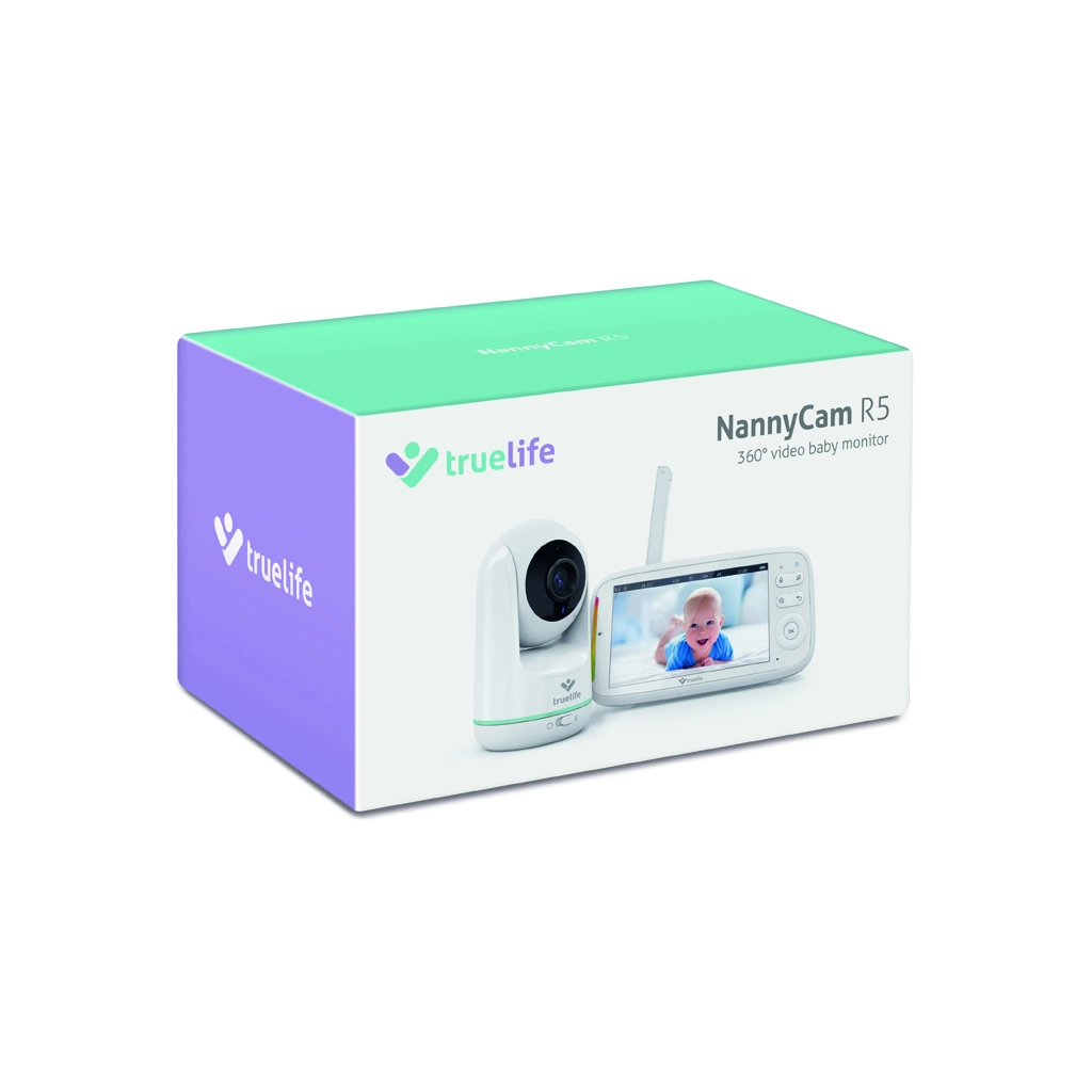 TrueLife NannyCam R5 je spoľahlivá videopestúnka pre moderných rodičov. Otočná kamera s horizontálnym rozsahom 330° a vertikálnym 135° v kombinácii so širokouhlou šošovkou pokryje celú izbu, zatiaľ čo HD rozlíšenie 720p zabezpečí čistý a ostrý obraz na 5" IPS LCD displeji. Automatické nočné videnie s infračervenými diódami sa aktivuje samo, takže uvidíte bábätko aj v úplnej tme.