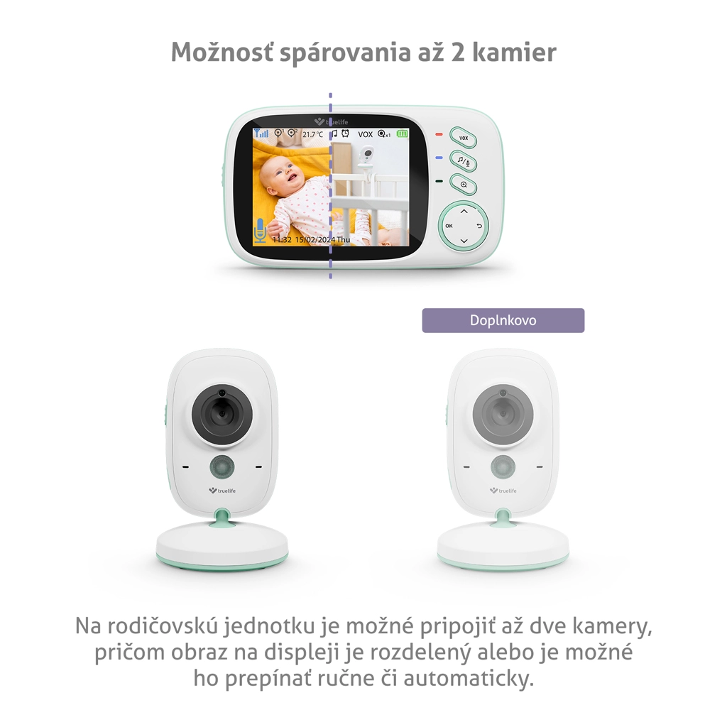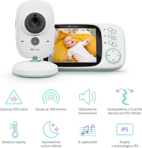Praktický režim VOX predlžuje výdrž batérie až na 20 hodín tým, že obrazovku prebudí až pri zaznamenaní zvuku. Pestúnka tiež meria teplotu v miestnosti a upozorní na jej zmeny. S robustným dosahom až 300 m na voľnom priestranstve sa môžete doma voľne pohybovať. Pre väčšie pokrytie možno spárovať až 2 kamery a kameru nakloniť podľa potreby; k postieľke možno dokúpiť držiak TrueLife NannyCam H32 Holder.