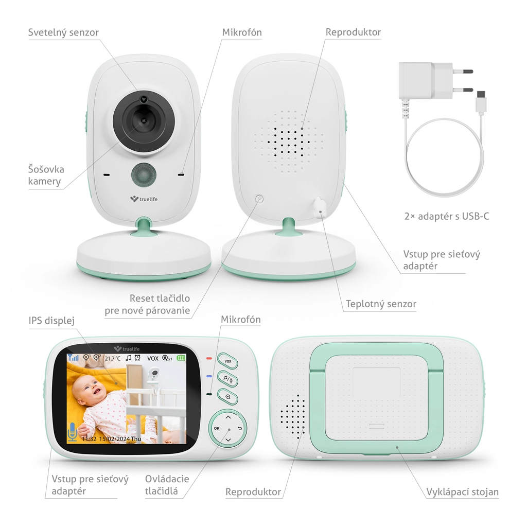 - Kamera (detská jednotka), rodičovská jednotka, 2× adaptér s USB-C, návod