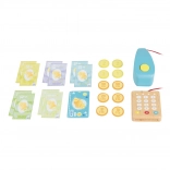 Súčasťou setu sú aj papierové bankovky a drevené mince, ktoré podporujú rozvoj jemnej motoriky a základných matematických zručností. Kvalitné drevené prevedenie zaisťuje dlhú životnosť a bezpečnú hru.