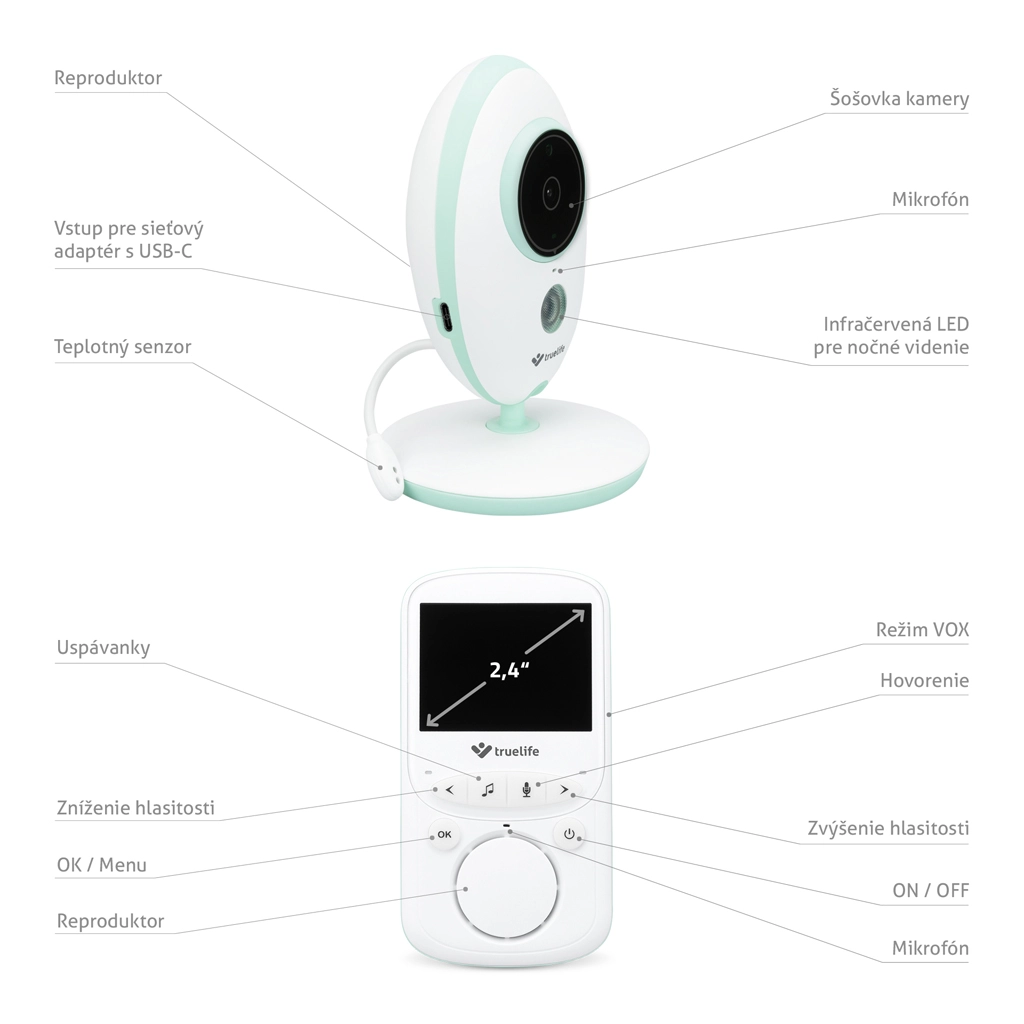 Digitálna video pestúnka TRUELIFE NannyCam V24 Pro ponúka čistý obraz vo dne aj v noci, prehľadný 2,4" farebný LCD, stabilný prenos 2,4 GHz až do 300 m a obojstrannú komunikáciu. Vďaka režimu VOX vydrží rodičovská jednotka na batériu až 24 hodín. Nechýba nočné videnie, meranie izbovej teploty, ukolísanky a moderné USB‑C nabíjanie vrátane podpory powerbanky.