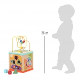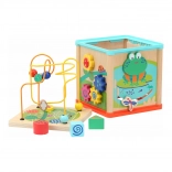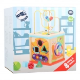 Zábavná a vzdelávacia motorická kocka pre najmenších rozvíja jemnú motoriku, koordináciu oko–ruka aj priestorovú orientáciu. Ponúka korálkové bludisko, vkladacie tvary, ozubené kolieska a ďalšie interaktívne prvky so zvieratkami. Vyrobená z pevnej preglejky a odolného plastu pre dlhú životnosť a bezpečnú hru.
