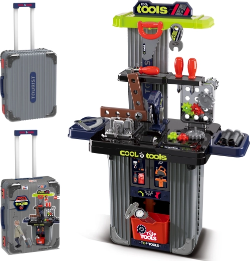 Tento šikovný 2 v 1 kufrík sa behom chvíľky premení na stabilný pracovný stôl s náradím. Deti si môžu vyskúšať prácu s vŕtačkou, kladivkom a ďalšími nástrojmi, rozvíjať technické zručnosti a užiť si autentickú hru na malých opravárov. Kvalitné plastové prevedenie zaisťuje bezpečnosť a ľahké uchopenie do malých rúk.