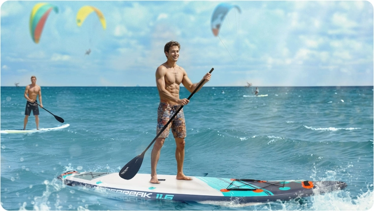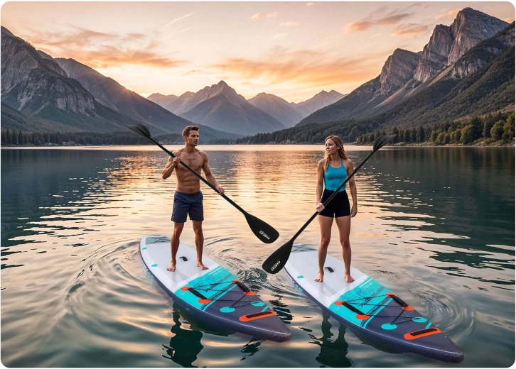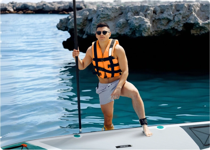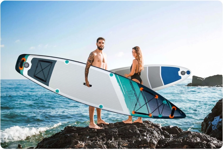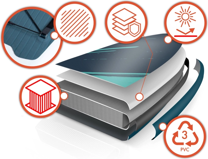 Konštrukcia Drop Stitch Light s trojvrstvovým PVC, uhlíkovou výstužou hrany a zosilnenými švami spája nízku hmotnosť (cca 14 kg) s vysokou tuhosťou a odolnosťou proti UV. Protišmyková EVA je príjemná na bosú nohu, nešmýka sa a tlmí nárazy. Predný elastický cargo bungee bezpečne drží batoh či uterák, tesný ventil spoľahlivo udržiava tlak a súčasťou je aj kľúč na odvzdušnenie.