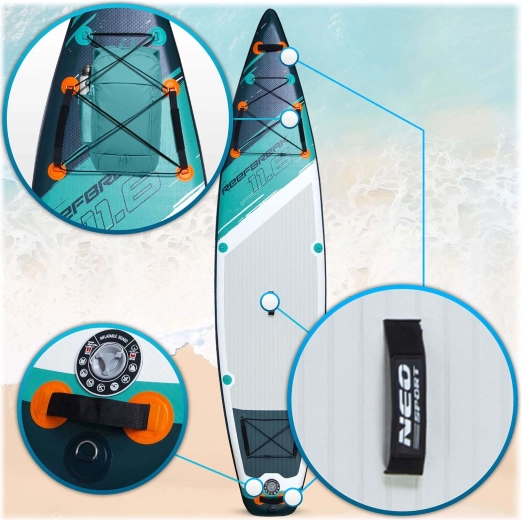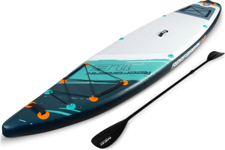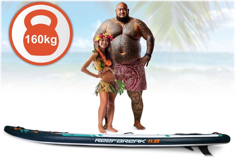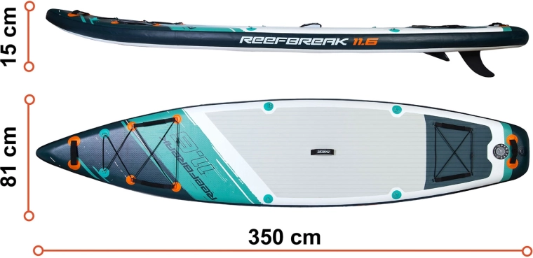 Reefbreak 350 × 81 × 15 cm je prémiový all‑round SUP pre pokojnú vodu aj menšie vlny. Vďaka šírke 81 cm ponúka výbornú stabilitu pre začiatočníkov, zatiaľ čo dĺžka 350 cm pomáha k lepšiemu sklzu a smerovej stabilite na dlhších výjazdoch. Maximálna nosnosť 160 kg a objem 332 l umožnia pohodlne previezť výbavu alebo partnera. Päť praktických transportných úchopov uľahčí manipuláciu na brehu aj z vody.