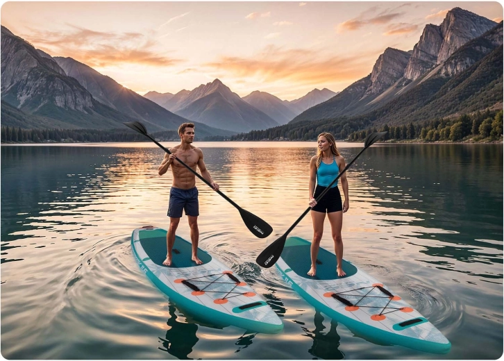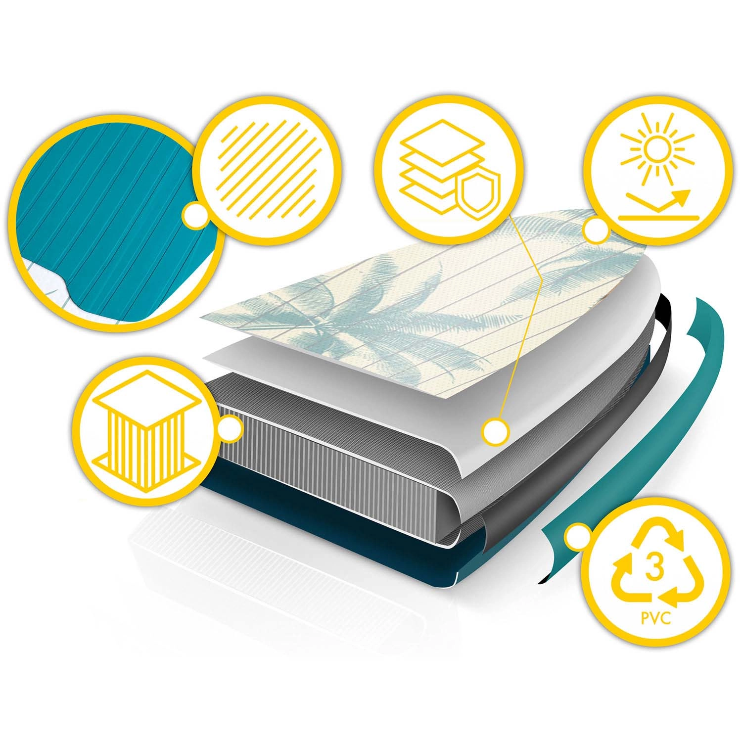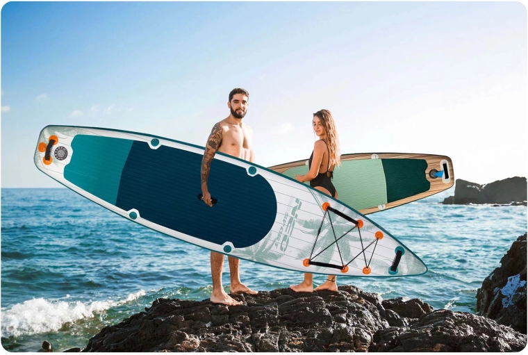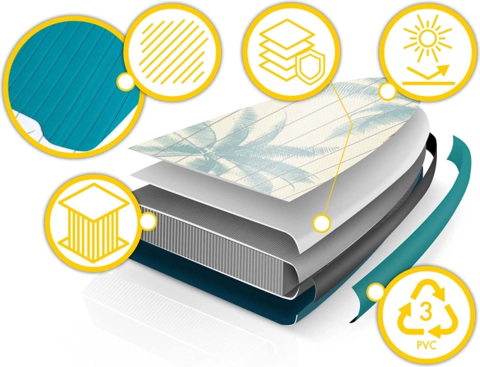Viacvrstvové PVC s drop-stitch jadrom zabezpečuje vysokú tuhosť, odolnosť a dlhú životnosť, pritom si zachováva nízku hmotnosť pre jednoduché prenášanie.