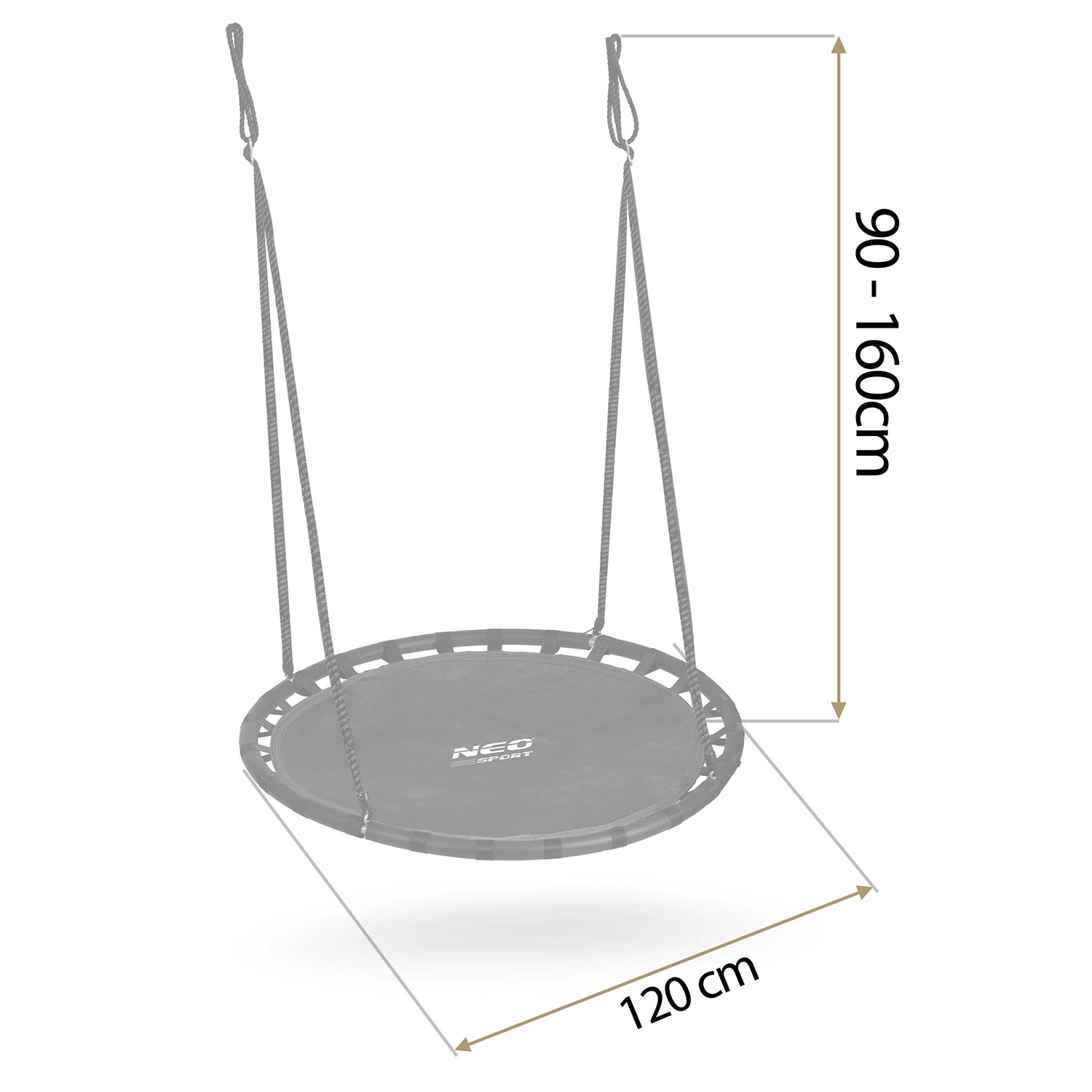 Užite si hodiny zábavy a relaxu s kruhovou hojdačkou hniezdo s priemerom 120 cm od NEO-SPORT. Ponúka priestranné a pohodlné sedenie, vodoodolný materiál Oxford 600D, masívny oceľový rám s penovým polstrovaním a silné, nastaviteľné laná pre bezpečné a stabilné hojdanie doma aj na záhrade.