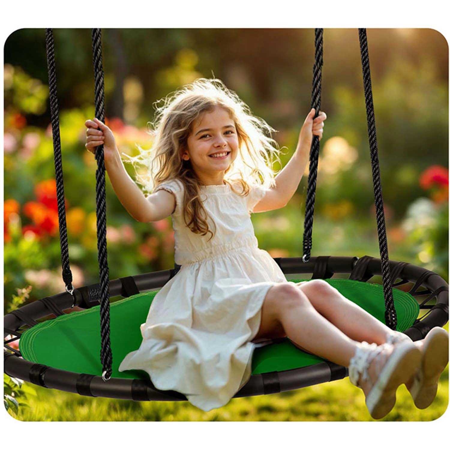 Vďaka nastaviteľným lanám ľahko prispôsobíte výšku podľa veku a vzrastu dieťaťa. Pevné polyesterové šnúry držia stabilitu a zabezpečujú hladký, plynulý pohyb. Inštalácia je rýchla a údržba minimálna – ideálna voľba na dlhodobé a bezpečné používanie na čerstvom vzduchu.