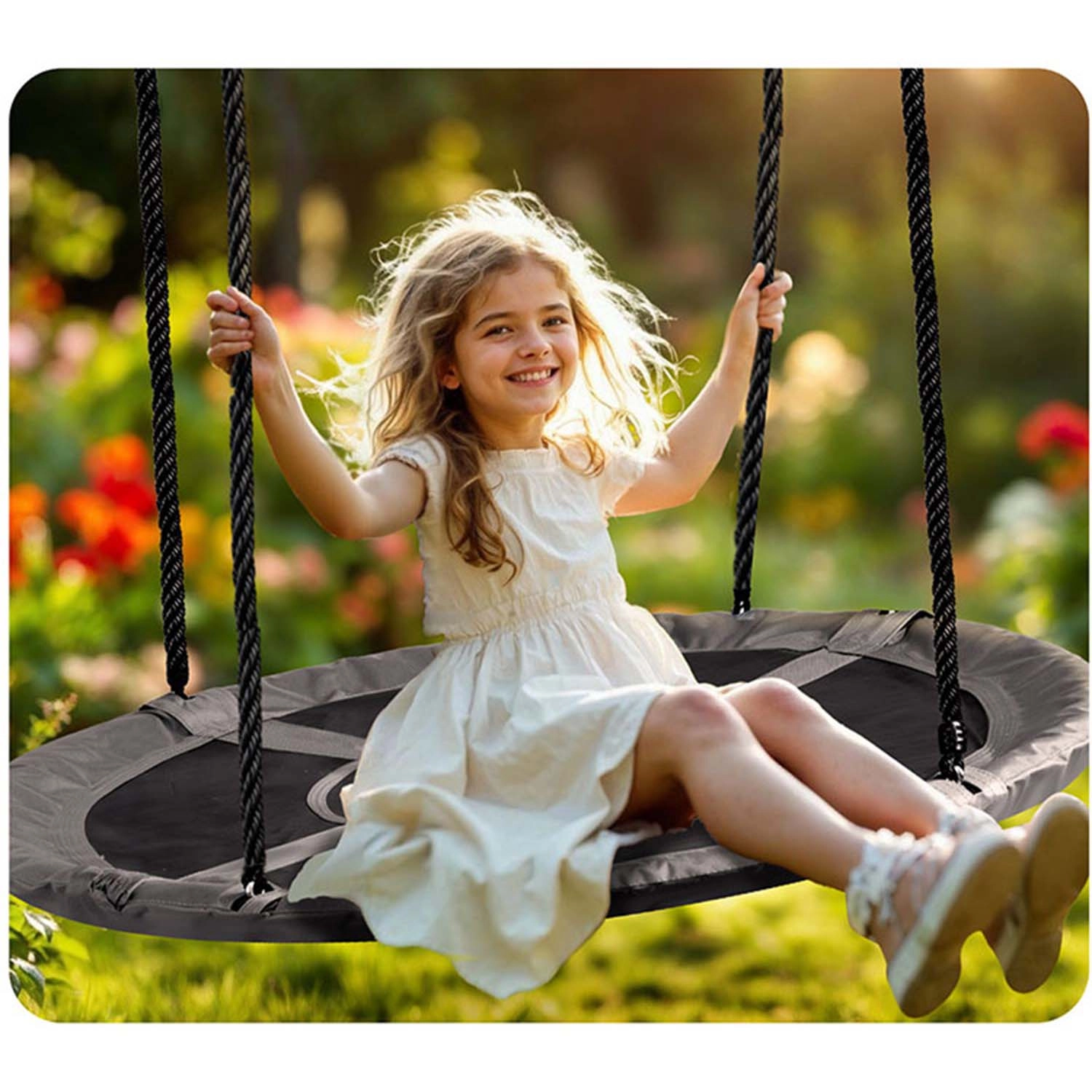 Štvorbodové zavesenie a silné pletené laná zabezpečujú stabilitu a bezpečnosť. Výšku možno jednoducho nastaviť podľa potrieb a výšky dieťaťa, takže hojdačka doslova rastie s ním. Široký priemer 100 cm poskytuje dostatok priestoru na sedenie aj ležanie a zaručuje maximálne pohodlie.