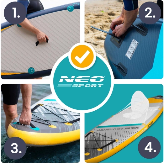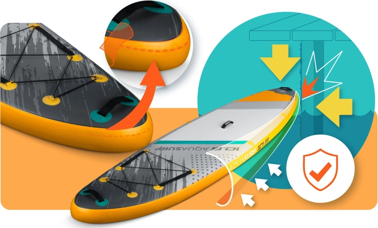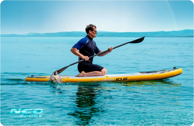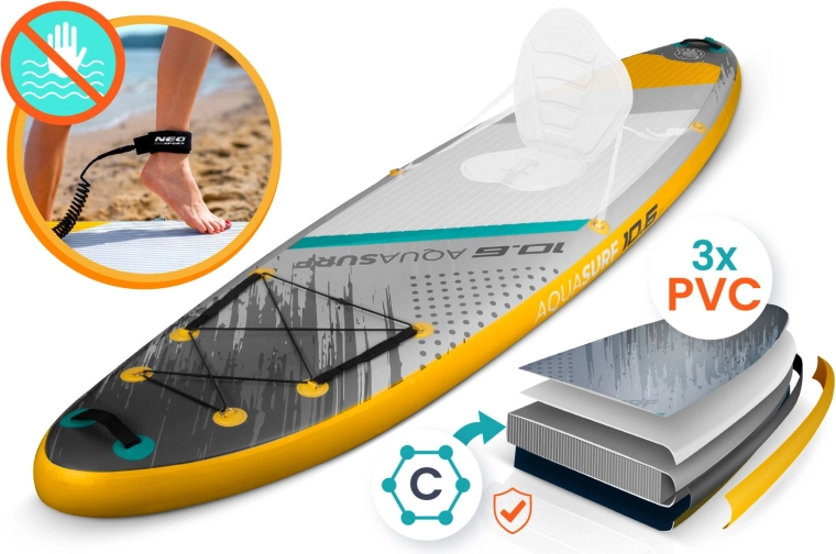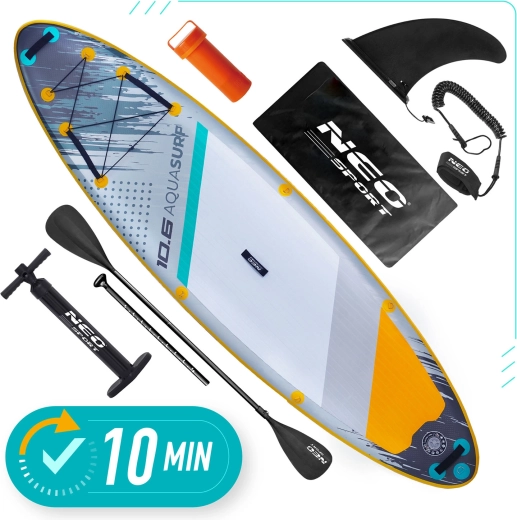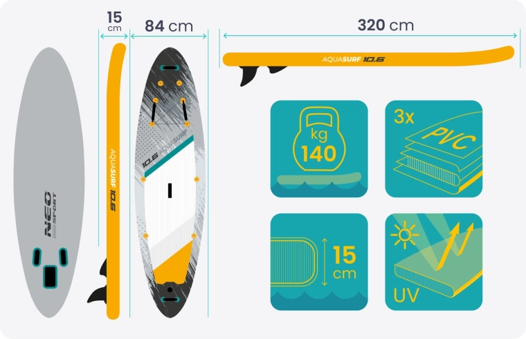 Nafukovací SUP AQUASURF 10'6 (320 cm) je skvelou voľbou pre začiatočníkov aj pokročilejších jazdcov. Široká a 15 cm hrubá konštrukcia z Drop Stitch Light a 3-vrstvového PVC poskytuje pevnosť, stabilitu a dlhú životnosť. Protisklzová EVA trakčná podložka dodá istotu aj s mokrými chodidlami, zatiaľ čo 3 stabilizačné plutvy uľahčia vedenie priameho smeru a manévrovanie.