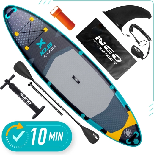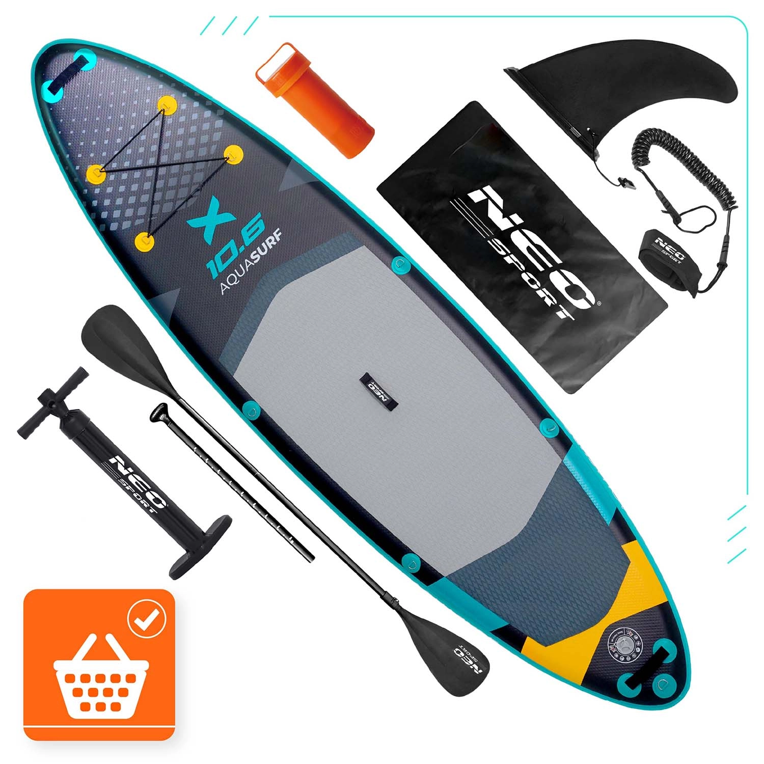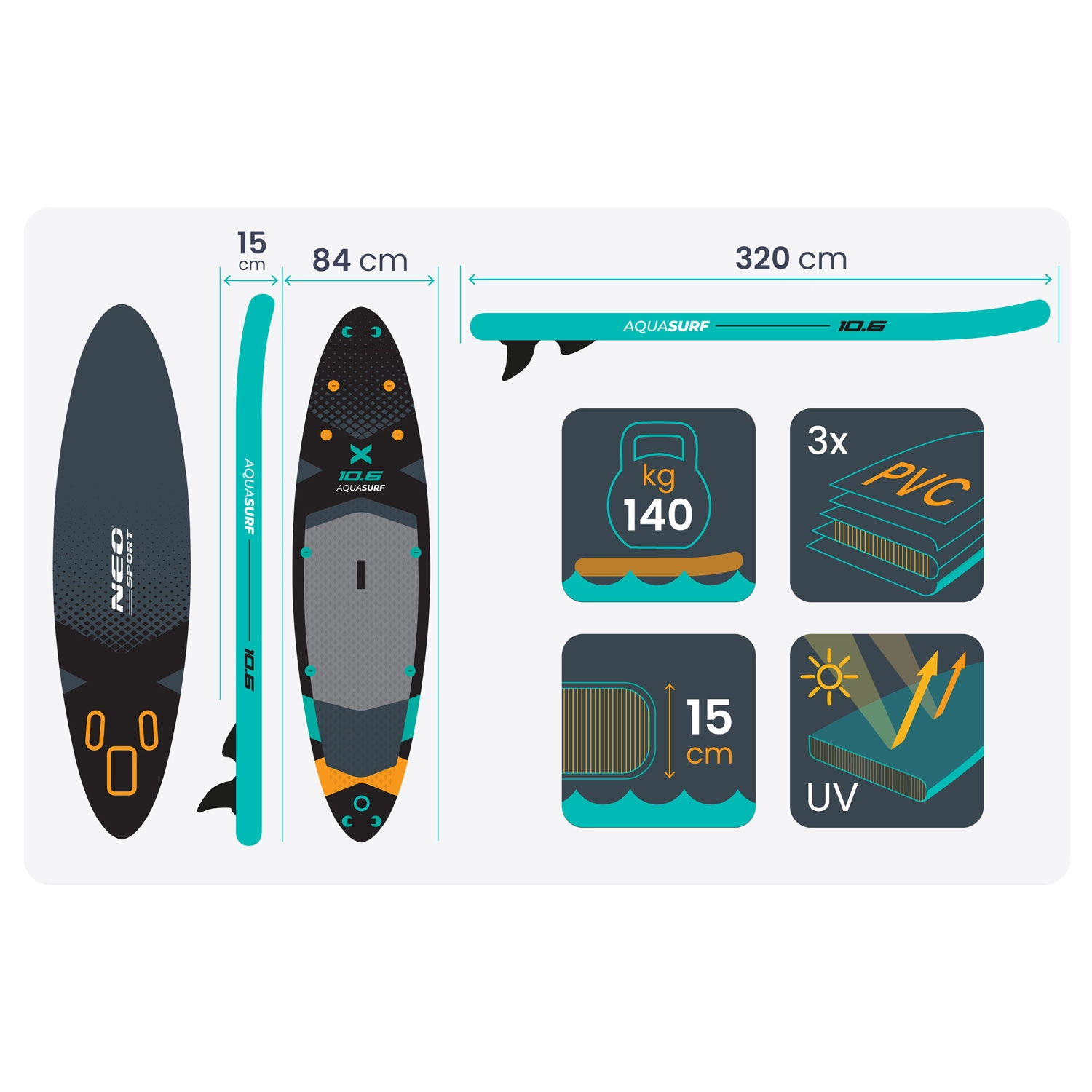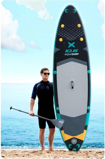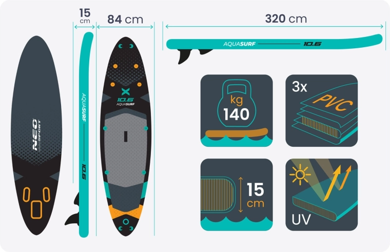 Paddleboard Aquasurf 10’6 je navrhnutý pre istotu pod nohami aj pohodlie na každom výlete. Široká plocha na státie, hrúbka 15 cm a tri stabilizačné plutvičky zabezpečujú pokojnú jazdu a jednoduché manévrovanie. Protišmyková EVA podložka drží aj s mokrými chodidlami a integrované bungee šnúry na palube bezpečne udržia batoh, fľašu alebo bundu.