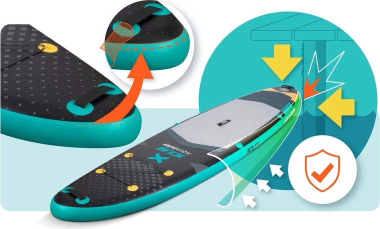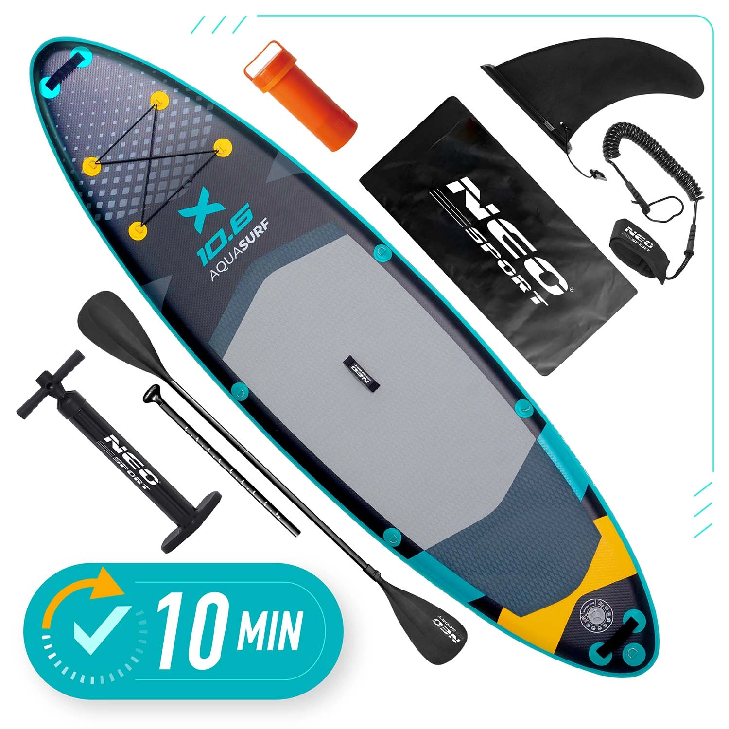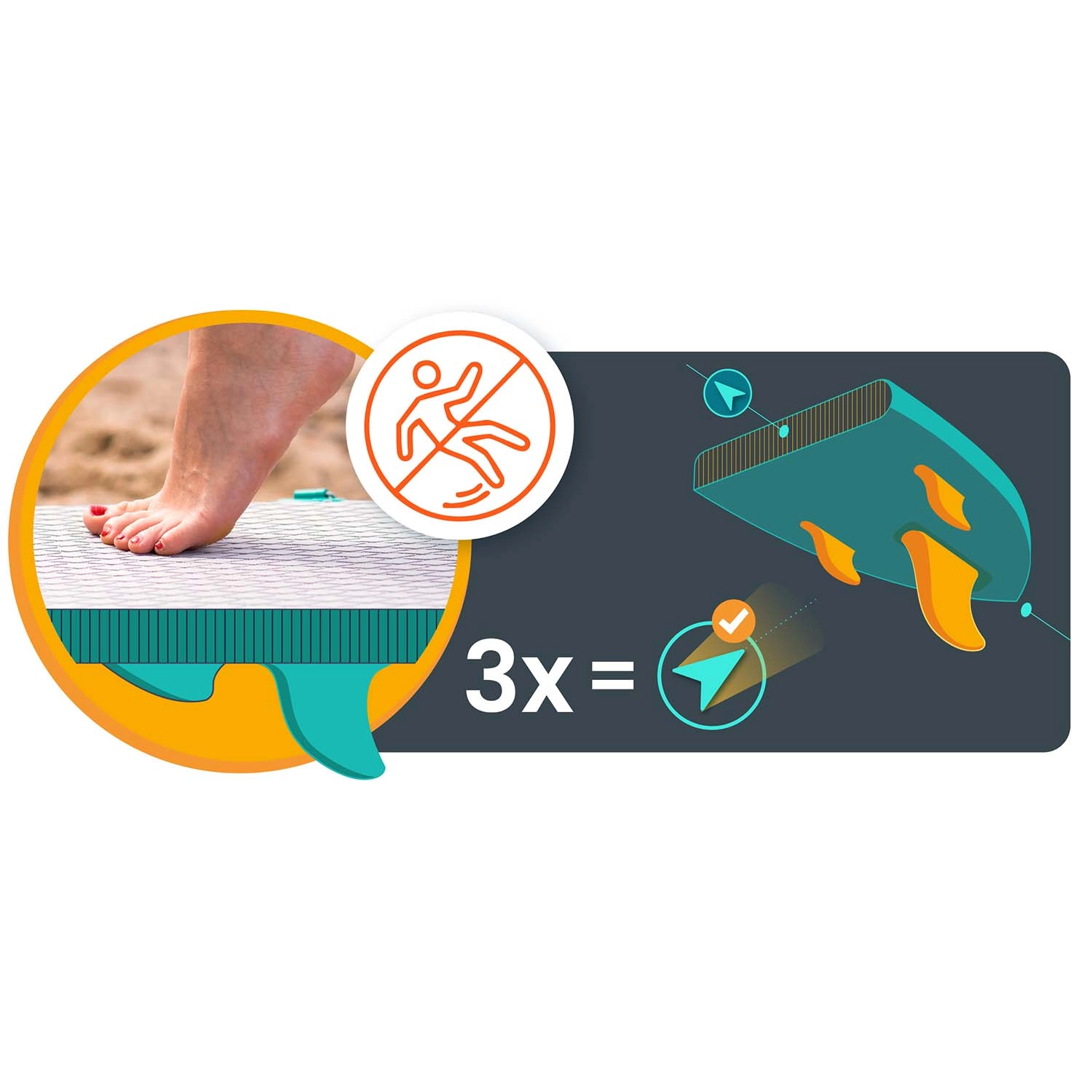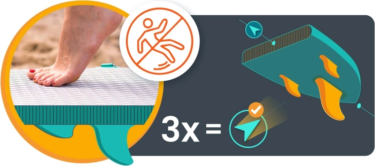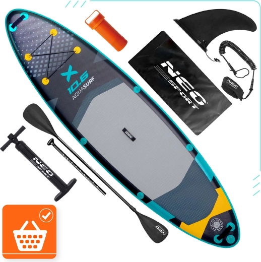 Paddleboard Aquasurf 10’6 je navrhnutý pre istotu pod nohami aj pohodlie na každom výlete. Široká plocha na státie, hrúbka 15 cm a tri stabilizačné plutvičky zabezpečujú pokojnú jazdu a jednoduché manévrovanie. Protišmyková EVA podložka drží aj s mokrými chodidlami a integrované bungee šnúry na palube bezpečne udržia batoh, fľašu alebo bundu.