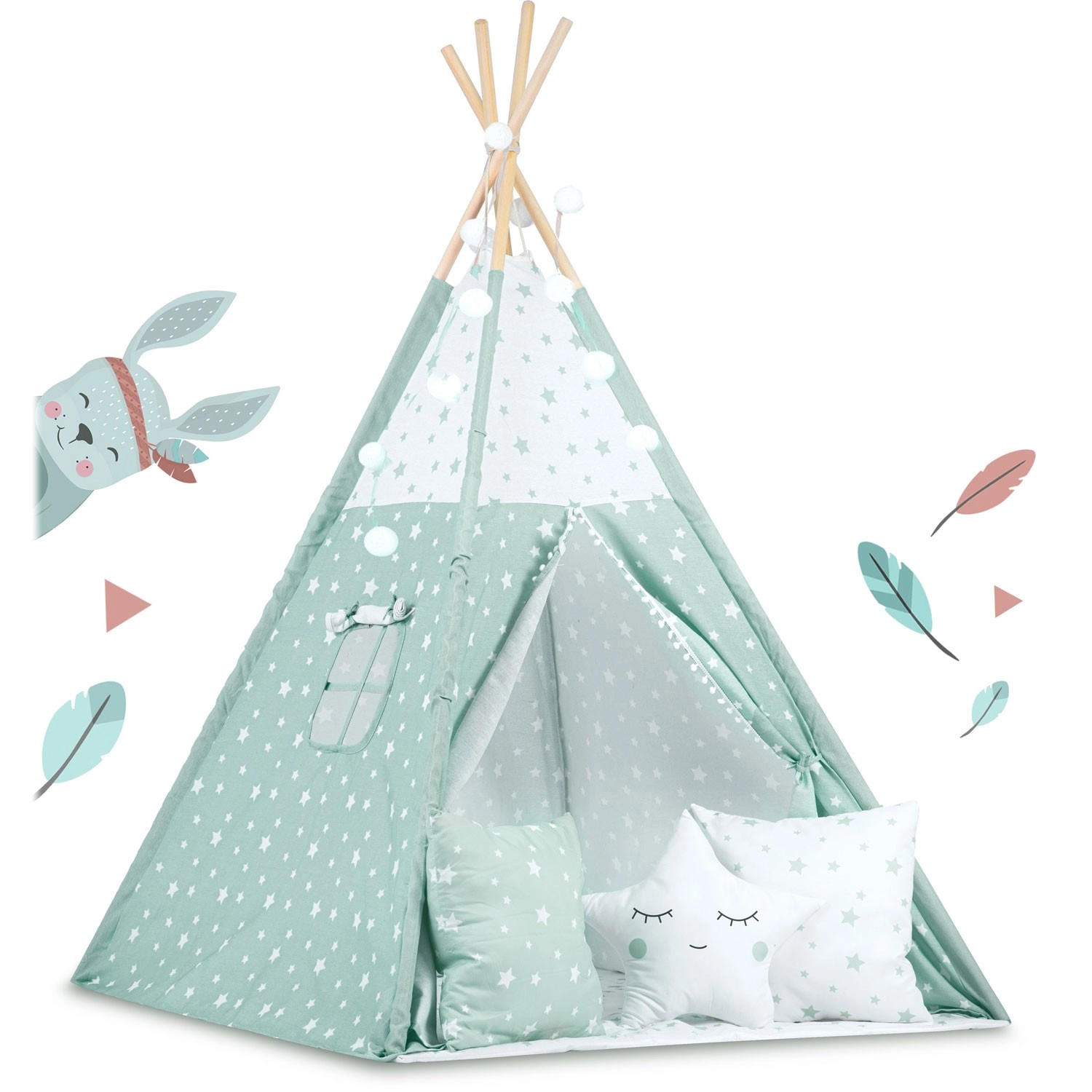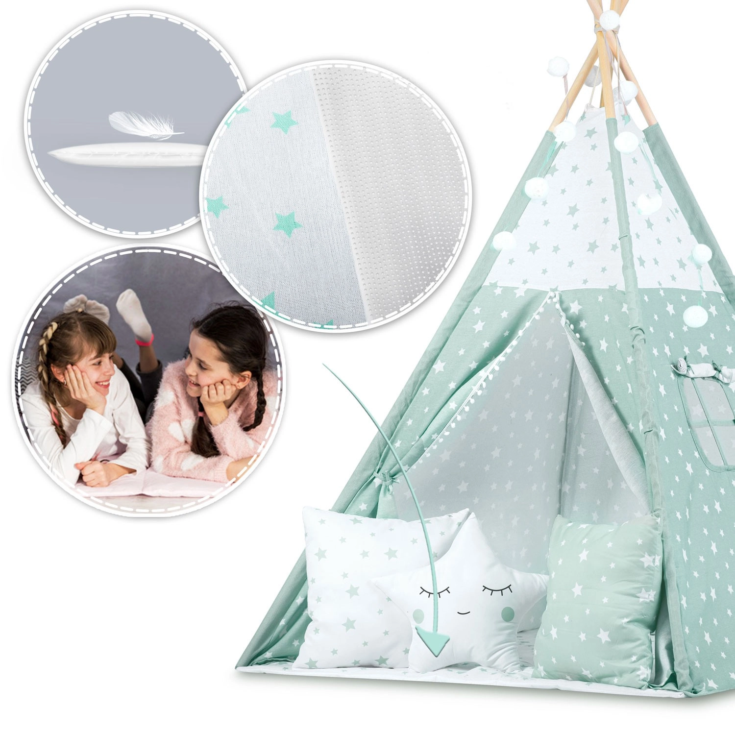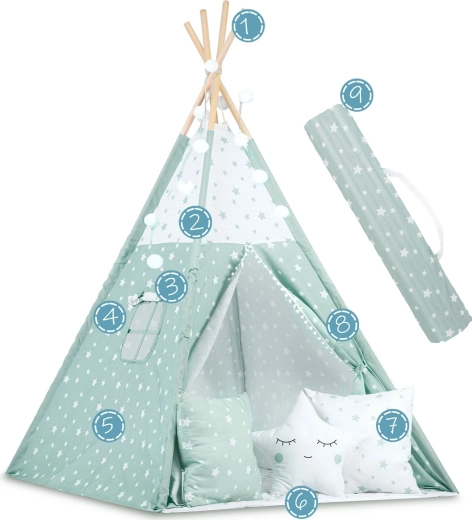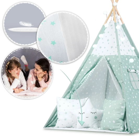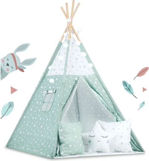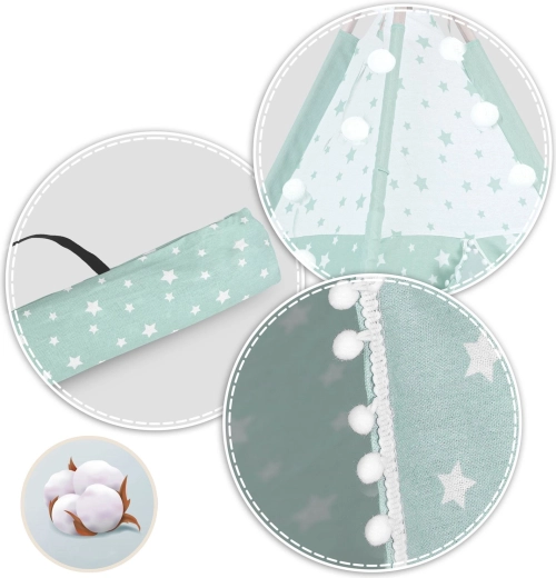 Štýlové detské teepee v jemnej mätovej farbe s bielymi hviezdičkami premení každú izbu na magické miesto pre hru a relax. Plášť je ušitý zo 100% prémiovej bavlny, ktorá je priedušná, jemná a zároveň odolná. Vďaka stabilizátoru a pevným smrekovým tyčiam je konštrukcia stabilná a bezpečná. Otváracie okienko s roletkou a zaväzovací vchod podporujú fantáziu a prinášajú viac svetla aj vzduchu.