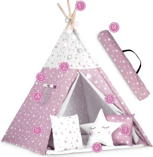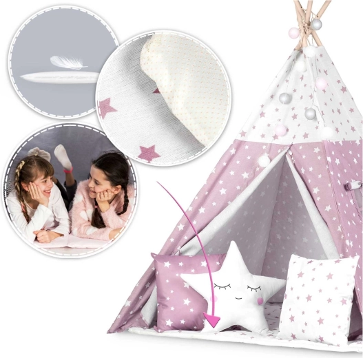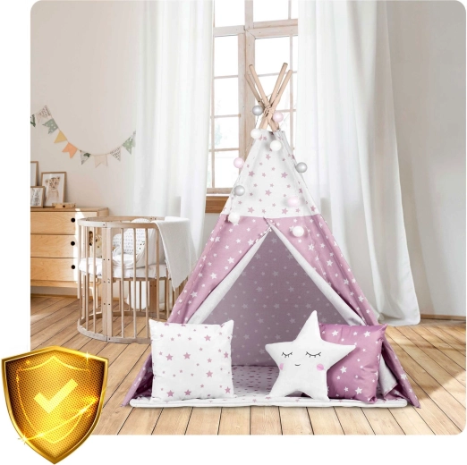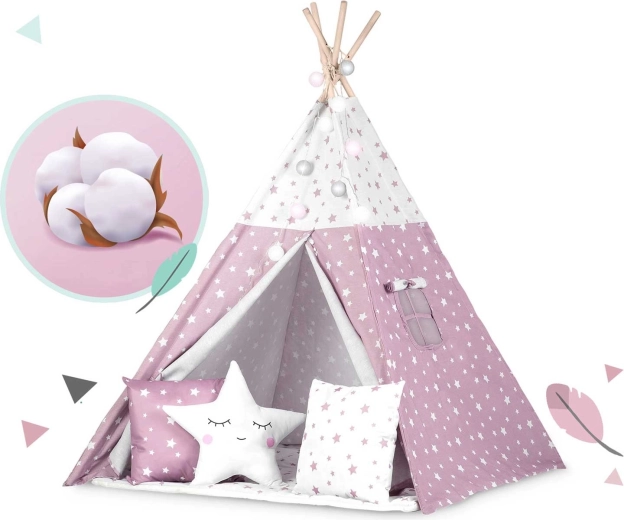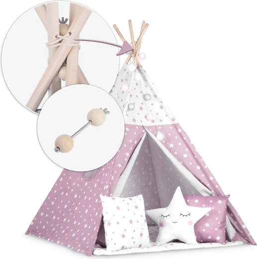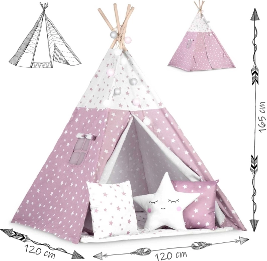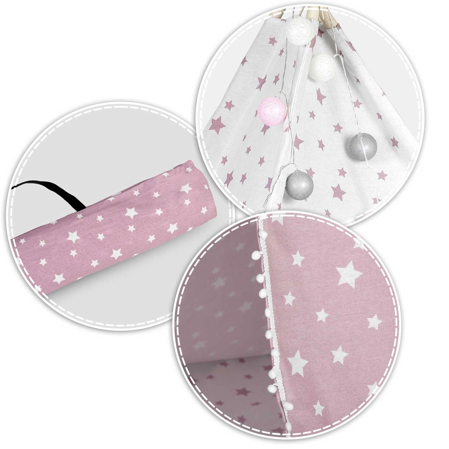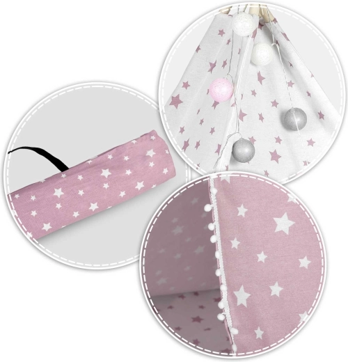 Detské teepee NUKIDO v ružovej farbe s hviezdičkami je krásny a funkčný prvok do detskej izby. Šité z prémiovej 100% bavlny s vyššou gramážou 175 g/m² pre príjemný dotyk, priedušnosť a dlhú životnosť. Stabilná smreková/borovicová konštrukcia so štyrmi tyčami je doplnená stabilizátorom pre bezpečnejšie používanie. Otvárací vchod so zaväzovaním a okienko s roletkou dodávajú teepee hravosť aj lepšiu cirkuláciu vzduchu.