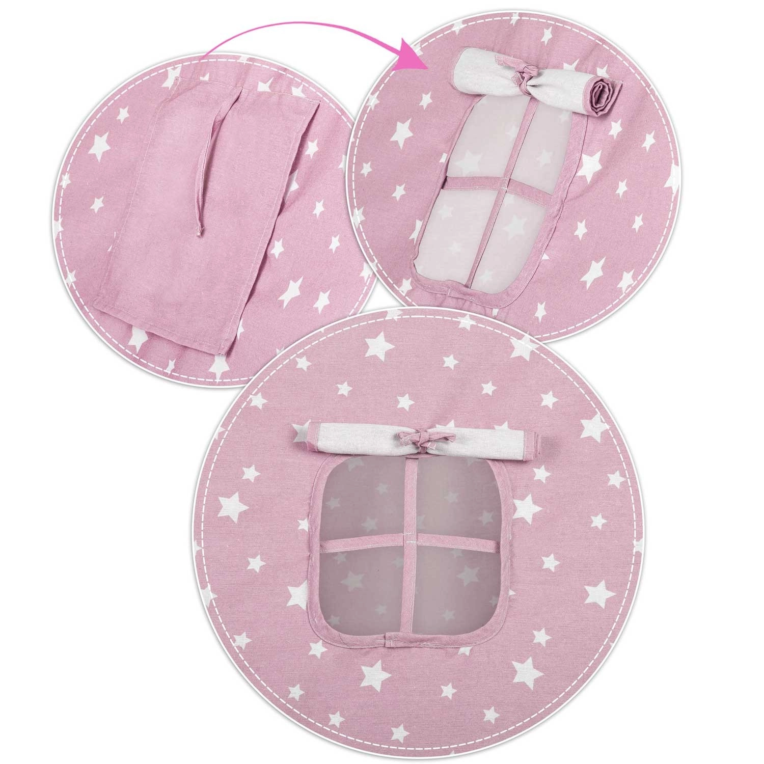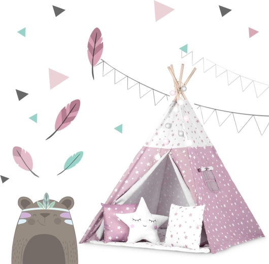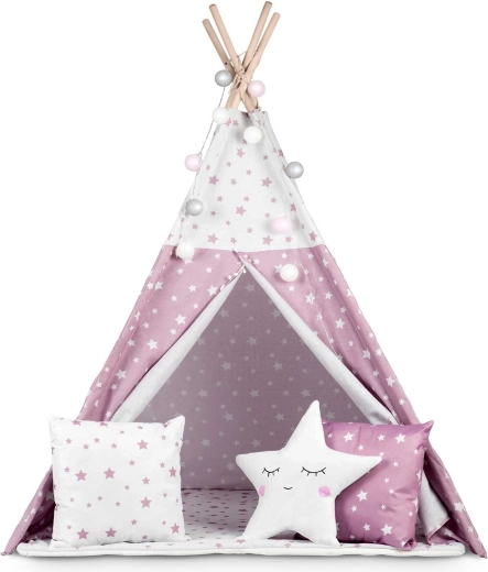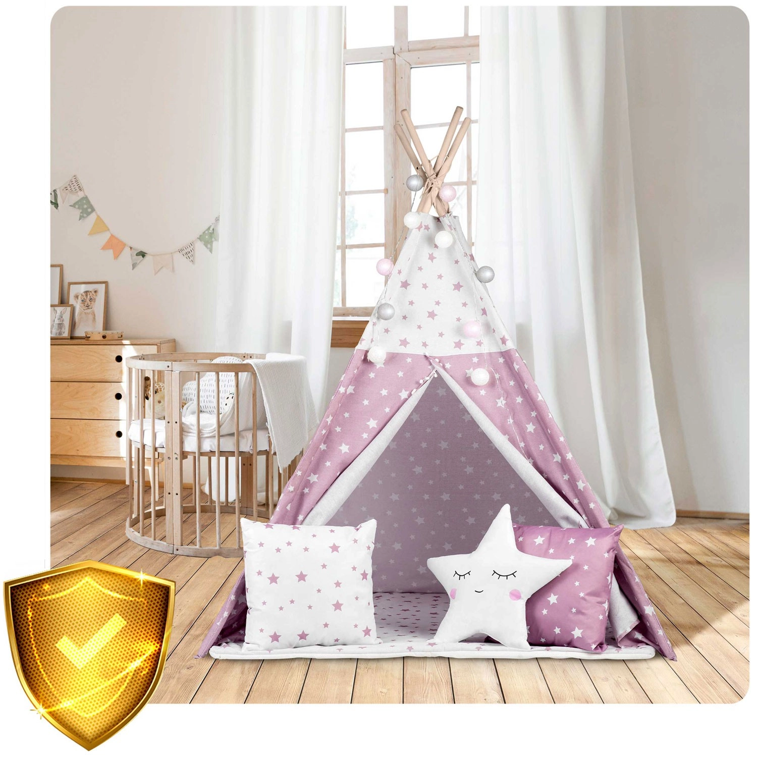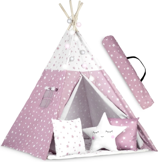 Detské teepee NUKIDO v ružovej farbe s hviezdičkami je krásny a funkčný prvok do detskej izby. Šité z prémiovej 100% bavlny s vyššou gramážou 175 g/m² pre príjemný dotyk, priedušnosť a dlhú životnosť. Stabilná smreková/borovicová konštrukcia so štyrmi tyčami je doplnená stabilizátorom pre bezpečnejšie používanie. Otvárací vchod so zaväzovaním a okienko s roletkou dodávajú teepee hravosť aj lepšiu cirkuláciu vzduchu.