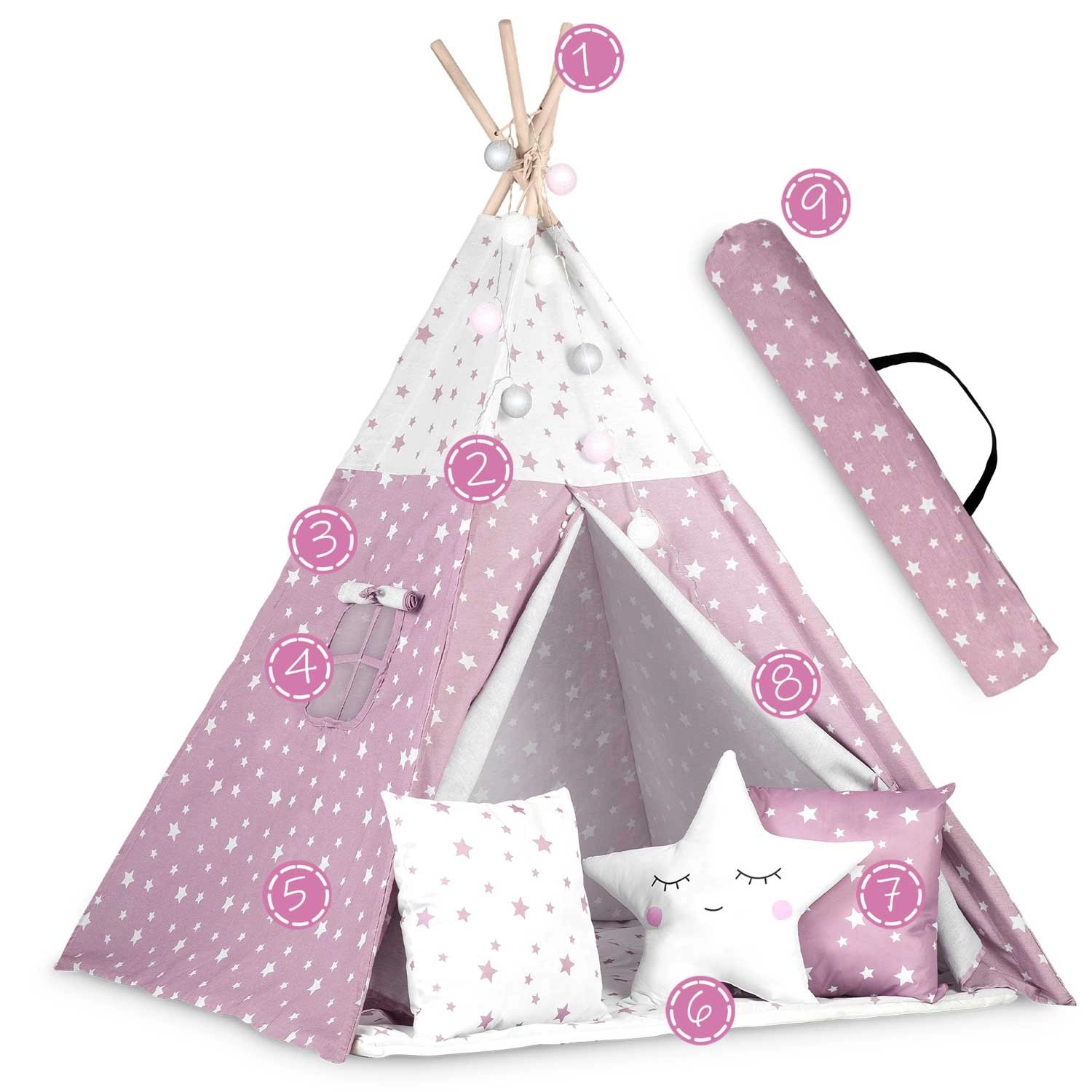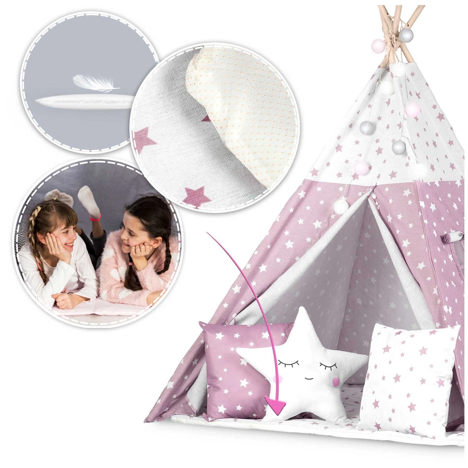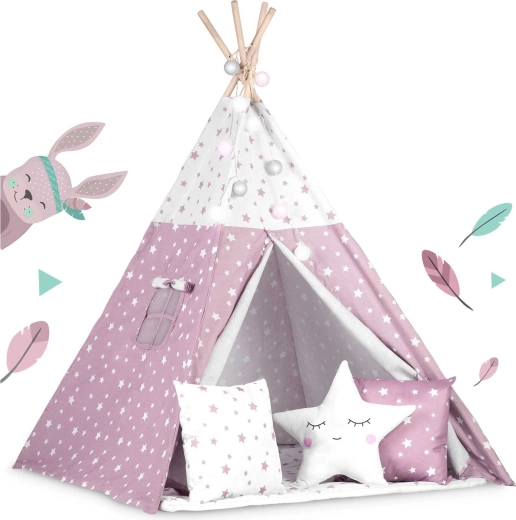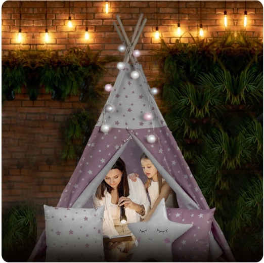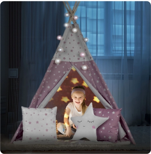 Súčasťou balenia je mäkká izolačná podložka s protišmykovými výstupkami a tri dekoratívne vankúšiky, ktoré zaistia pohodlie pri čítaní alebo oddychu. Vďaka LED svetielkam na batérie vytvoríte behom chvíľky čarovnú atmosféru. Teepee sa ľahko skladá, prenáša a vďaka priloženému púzdru ho uložíte alebo vezmete na terasu či do tieňa na záhradu.