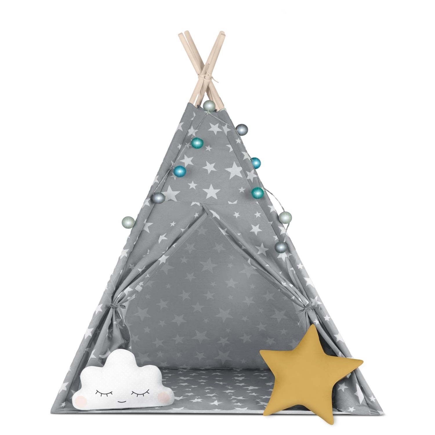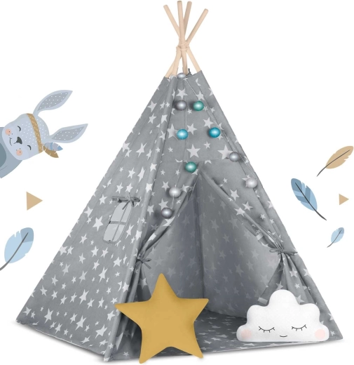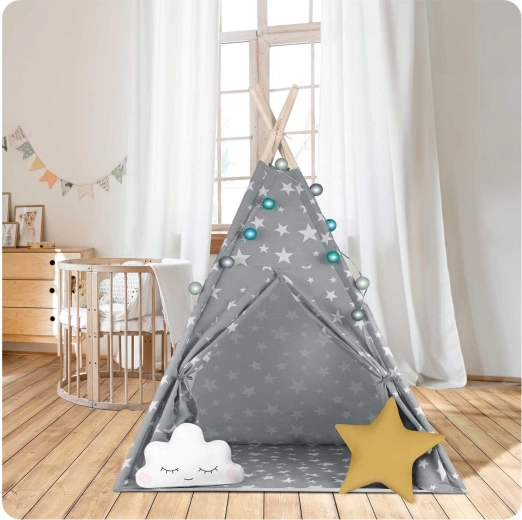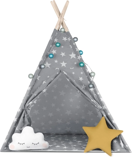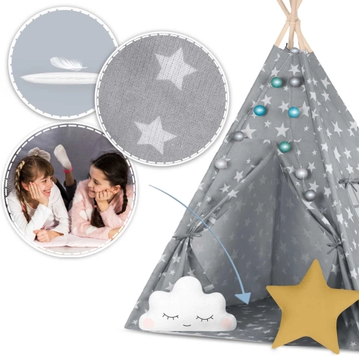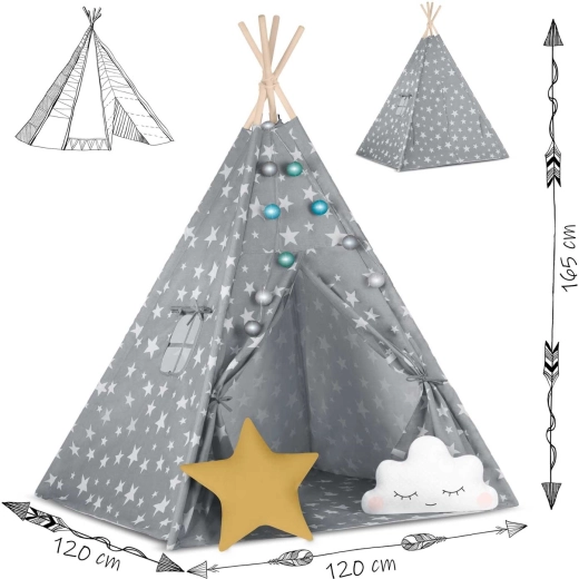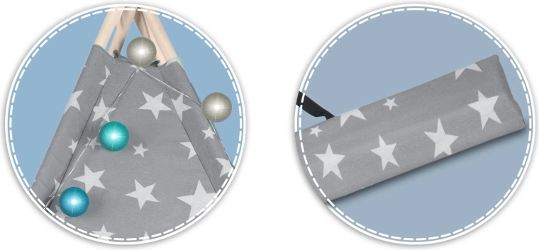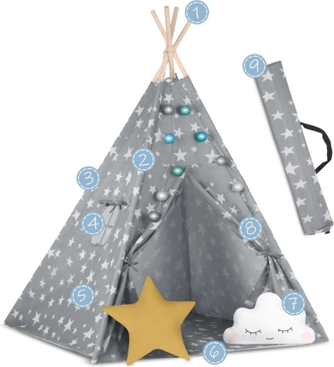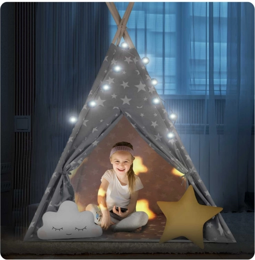 Súčasťou balenia je všetko, čo potrebujete: 4 borovicové tyče, stabilizátor pre extra pevnosť, LED svetielka (na batérie), všitá podložka, 2 mäkké vankúšiky v tvare obláčika a hviezdy, okienko s roletkou a praktický prenosný obal. Teepee ľahko zložíte aj prenesiete – perfektné do detskej izby, herného kútika aj na záhradu do tieňa.