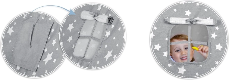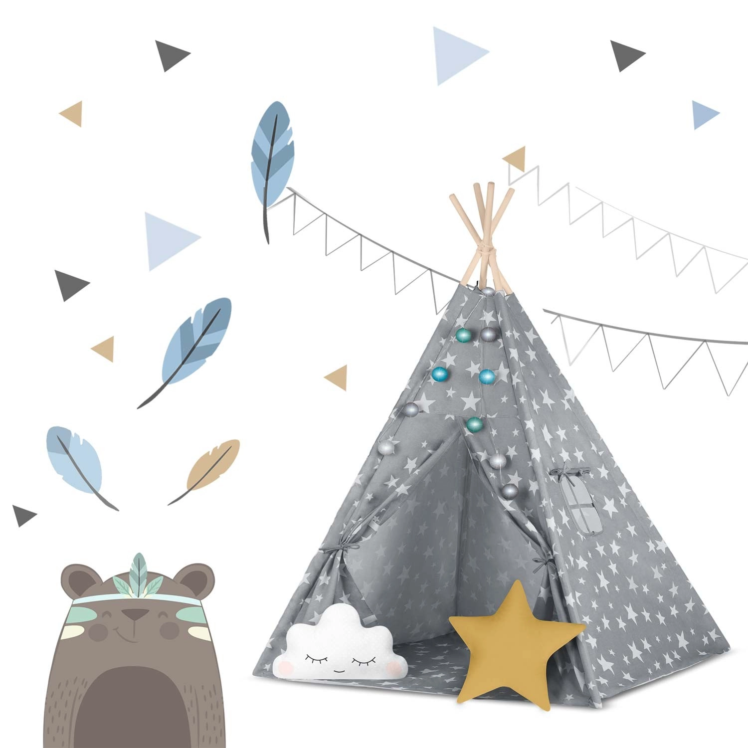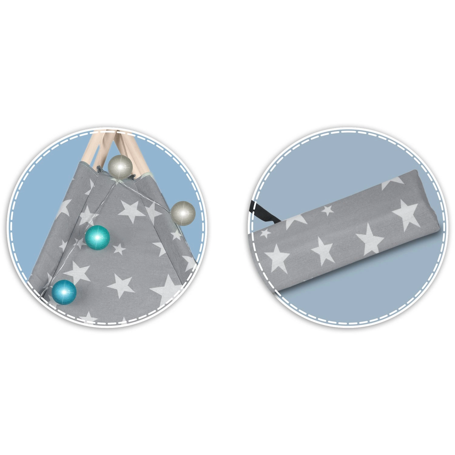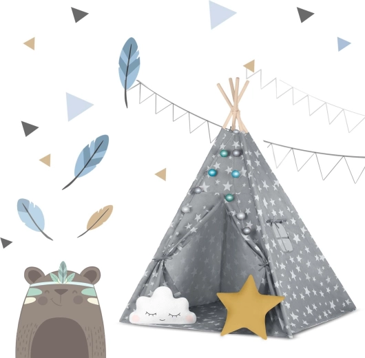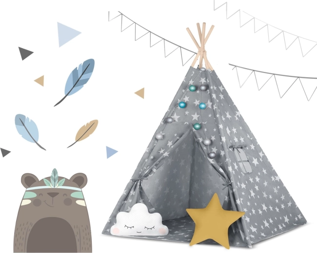 Súčasťou balenia je všetko, čo potrebujete: 4 borovicové tyče, stabilizátor pre extra pevnosť, LED svetielka (na batérie), všitá podložka, 2 mäkké vankúšiky v tvare obláčika a hviezdy, okienko s roletkou a praktický prenosný obal. Teepee ľahko zložíte aj prenesiete – perfektné do detskej izby, herného kútika aj na záhradu do tieňa.