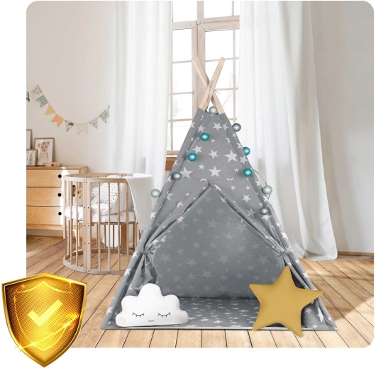 Detské teepee NUKIDO v elegantnej sivej s hviezdičkami je navrhnuté v duchu Montessori – podporuje samostatnosť, fantáziu a pokojné chvíľky na čítanie. Prírodné materiály a kvalitné spracovanie zabezpečujú bezpečie aj pohodlie, zatiaľ čo ľahká a priedušná prémiová bavlna udržiava príjemné prostredie po celý deň.