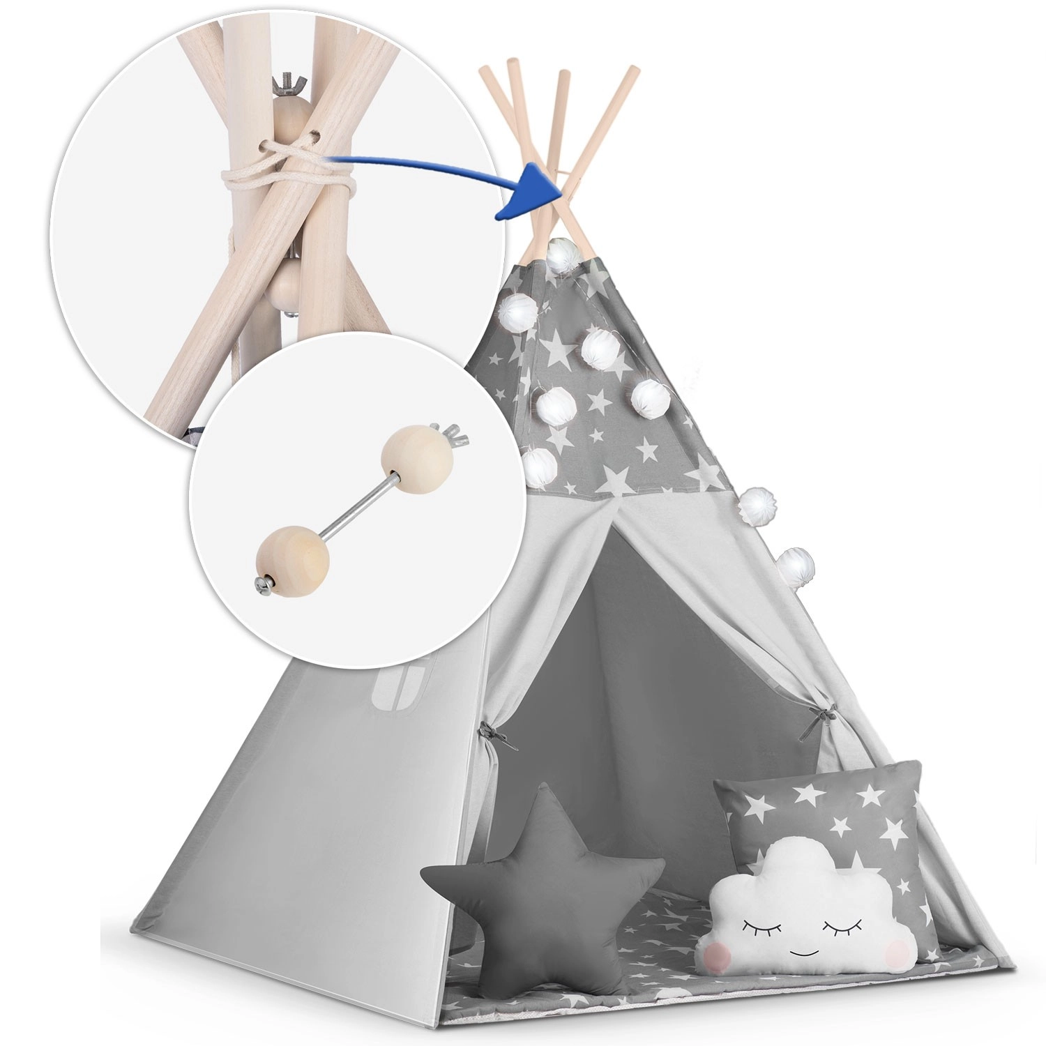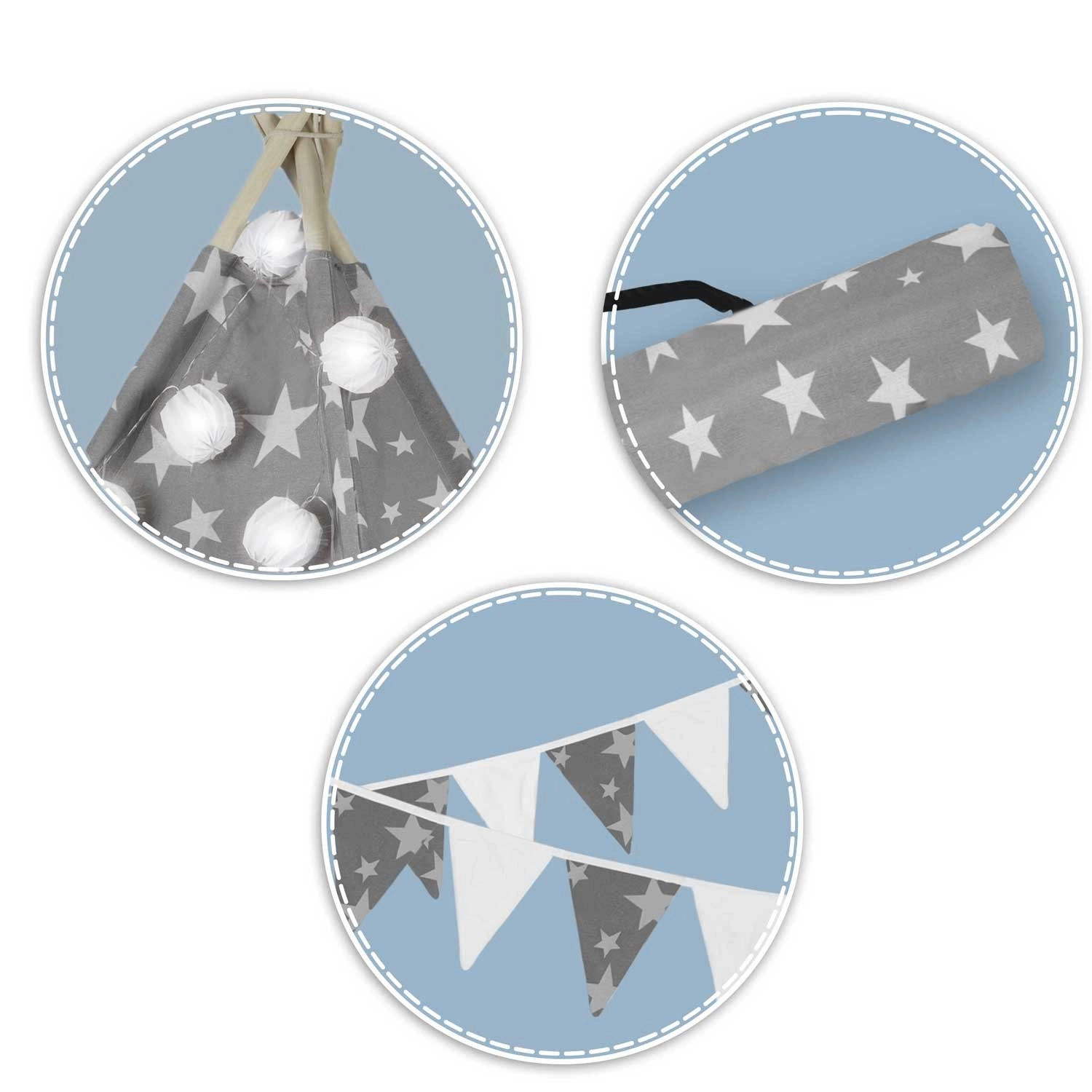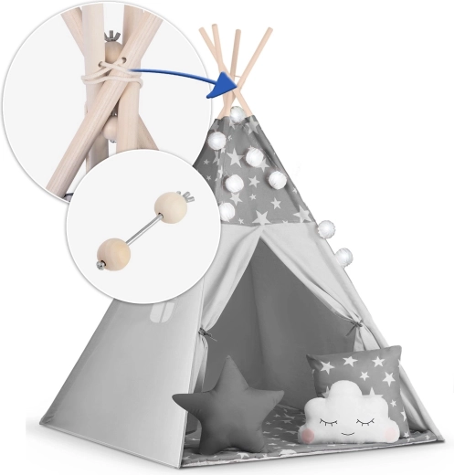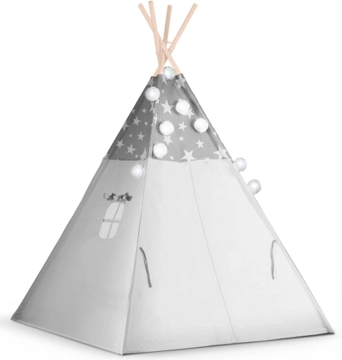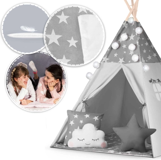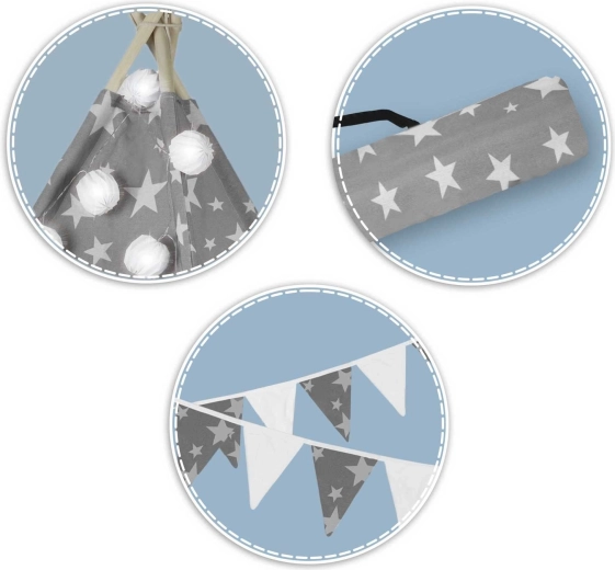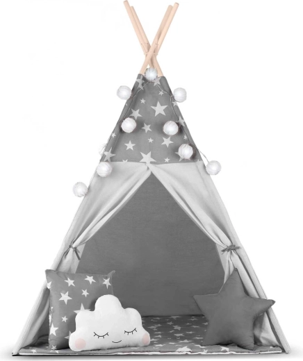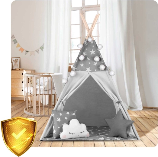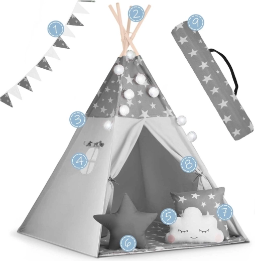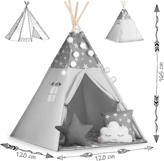 Vytvorte deťom ich vlastný útulný kútik s teepee NUKIDO. Tento štýlový stan v jemnej sivej farbe s hviezdičkami je ušitý z prémiovej bavlny, má stabilnú drevenú konštrukciu so stabilizátorom zdarma a súčasťou je mäkká izolačná podložka, 3 vankúšiky, girlanda, svetielka a prepravný obal. Ľahko sa skladá, skvele vetrá a je ideálny na hranie, čítanie aj oddych doma aj na záhrade.