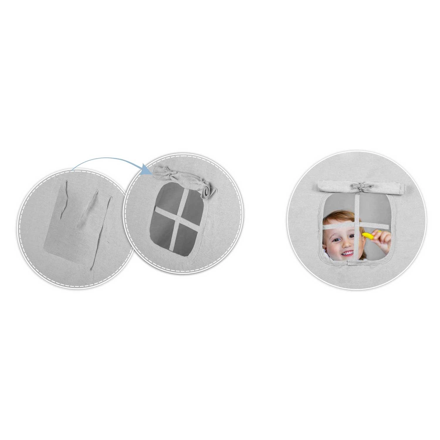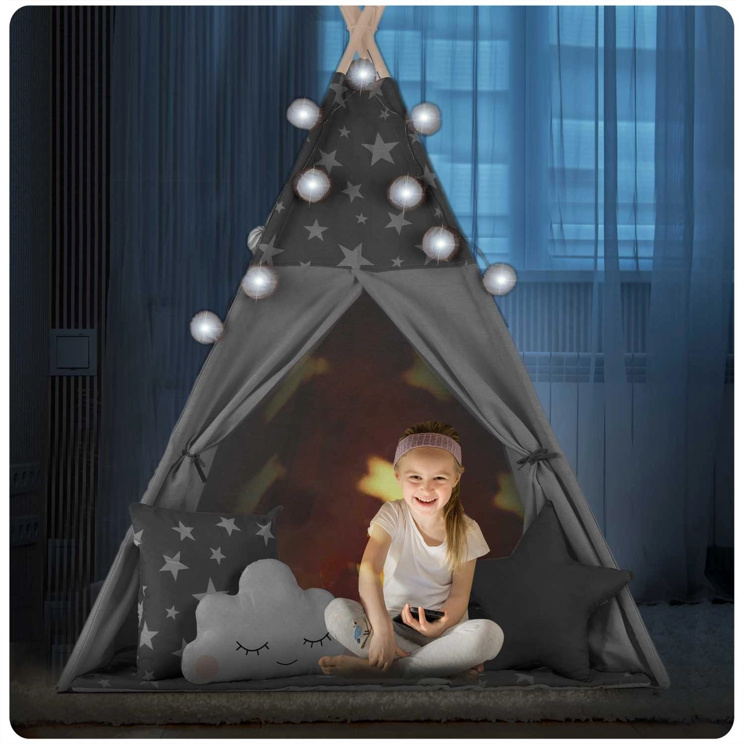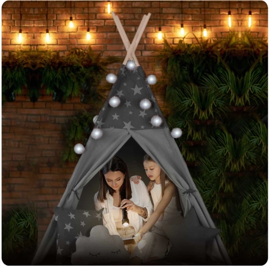 Pre maximálne pohodlie je v balení polstrovaná izolačná podložka s protišmykovou úpravou a tri dekoratívne vankúšiky. O atmosféru sa postarajú LED svetielka a girlanda, zatiaľ čo rolovacie okienko a viazacie vchody vedia kúzliť s priestorom a svetlom. Po zložení zaberie teepee minimum miesta a v priloženom obale ho ľahko prenesiete.