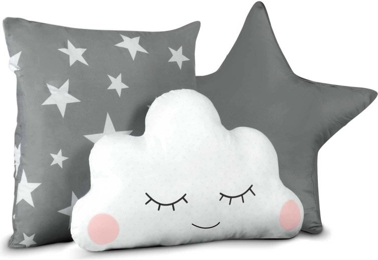 V balení nájdete polstrovanú podložku, 3 vankúšiky, LED svetielka, girlandu a praktický obal – všetko zladené do sivej s hviezdičkami.