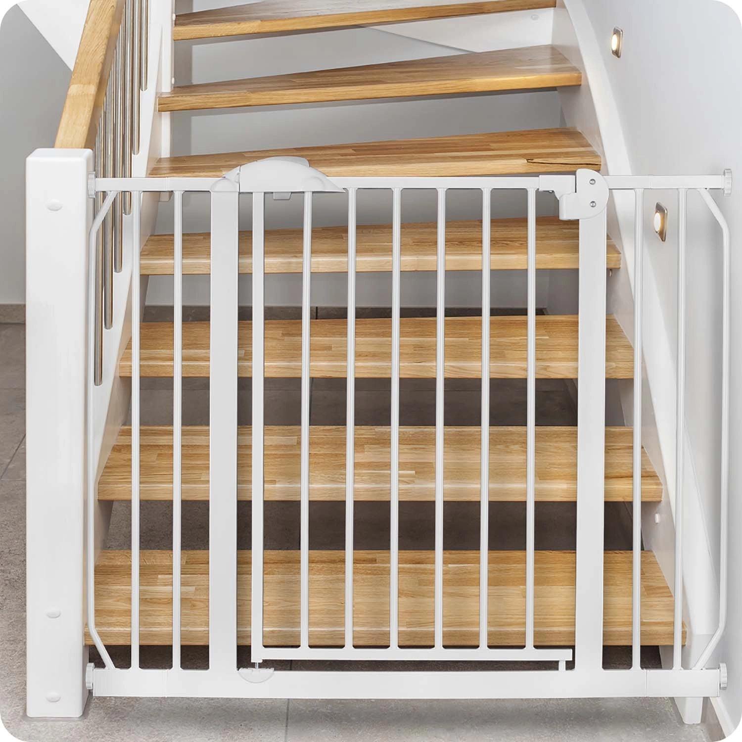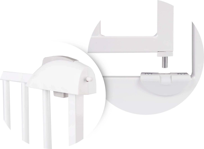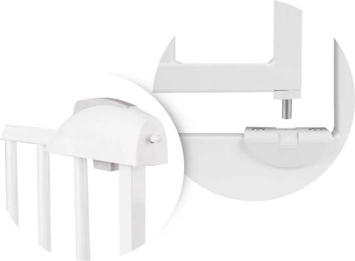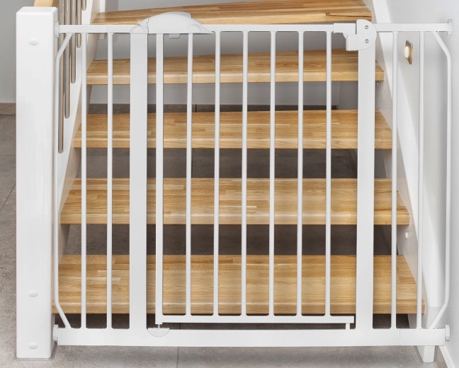 Bezpečnostná zábrana NUKIDO je ideálnym riešením na zabezpečenie priechodov a schodísk. Rozpieracia montáž bez vŕtania chráni steny aj zárubne, zatiaľ čo pevná kovová konštrukcia a spoľahlivý uzamykací mechanizmus udržia deti v bezpečí. Univerzálny biely dizajn sa hodí do každého interiéru.
