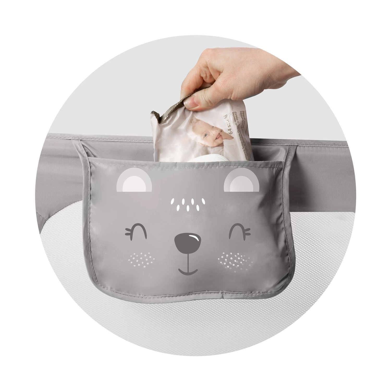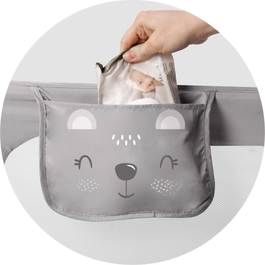Montáž je rýchla a flexibilná: zábranu možno pripevniť priamo k rámu postele pomocou skrutiek alebo ju zaistiť pomocou pásov SafetyBelt – pre maximálnu stabilitu je možné obe metódy aj skombinovať. Poistný zámok zabráni nechcenému zloženiu počas používania a praktické vrecko udrží cumlík, obrúsky či malé hračky vždy po ruke.