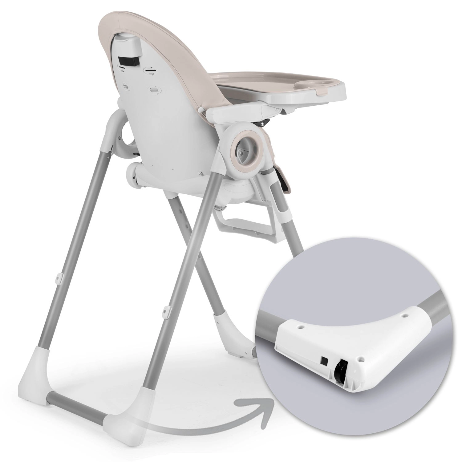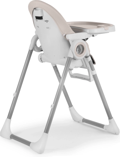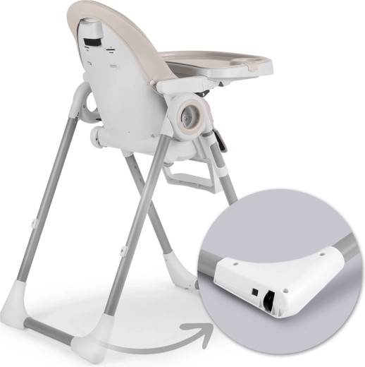 Odnímateľná tácka so zvýšenými okrajmi a prídavnou vložkou uľahčuje upratovanie po jedle – vložku možno sňať a opláchnuť pod tečúcou vodou. Poťahy sú odolné voči nečistotám a dajú sa jednoducho utrieť. Zadné kolieska pomôžu s rýchlym presunutím stoličky, zatiaľ čo široká základňa a 5-bodové pásy zabezpečujú stabilitu a bezpečie.