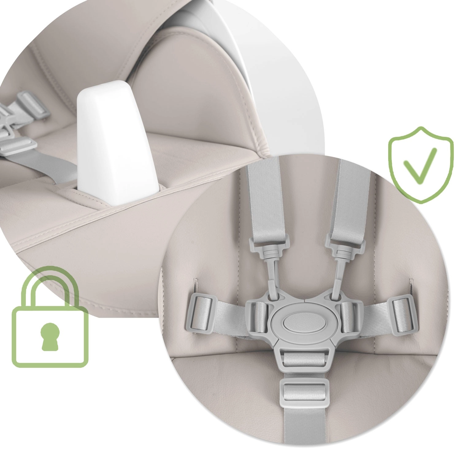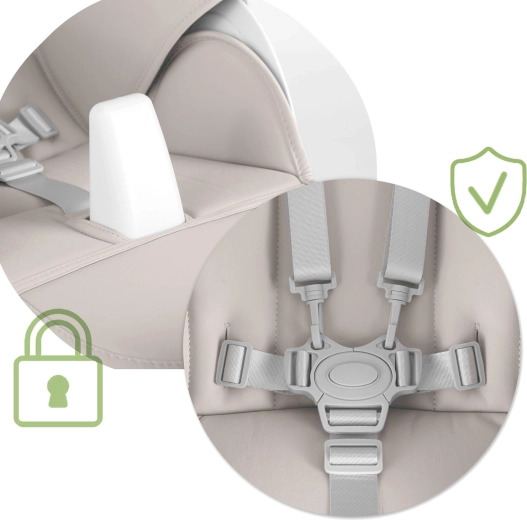Pohodlné polstrovanie, 5-bodové bezpečnostné pásy a stredová zarážka bránia skĺznutiu dieťaťa. Široká základňa zabezpečuje stabilitu pri kŕmení aj hraní.