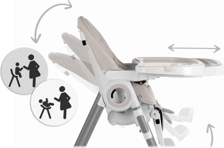 8-stupňová regulácia výšky, 5 polôh operadla chrbta a nastaviteľná opierka nôh umožnia používať stoličku od prvých mesiacov ako ležadlo až po samostatné stolovanie.