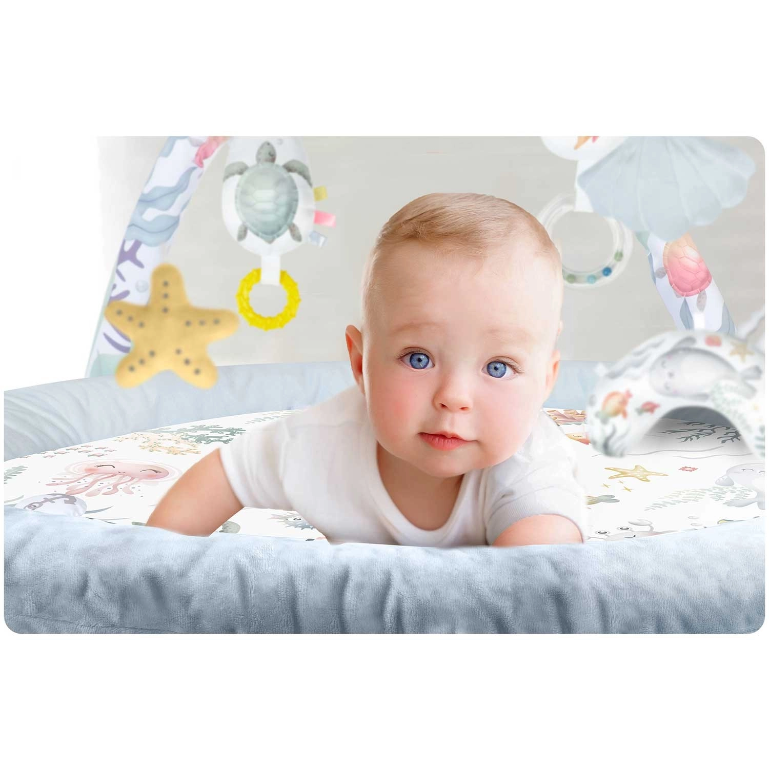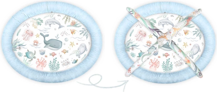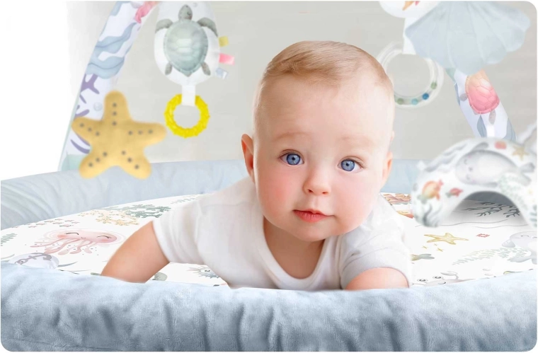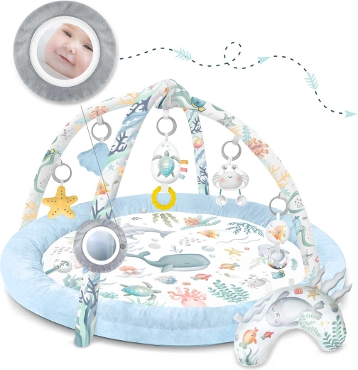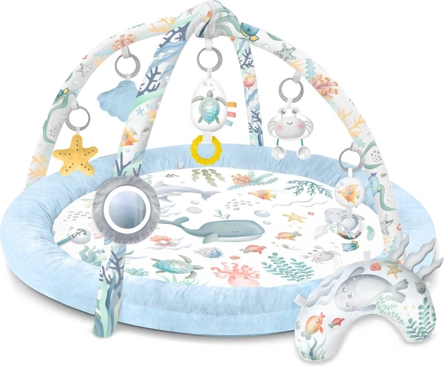 Hracia podložka Nukido Ocean vytvára útulné a bezpečné prostredie pre novorodencov aj väčšie bábätká. Dva skrížené oblúky nesú odnímateľné hračky, ktoré rozvíjajú zrak, hmat aj sluch – od zrkadielka na sebapoznanie cez hrkálky až po šuštivé prvky a pískajúceho kraba. Súčasťou je aj mäkký vankúšik na pohodlné hranie na brušku.
