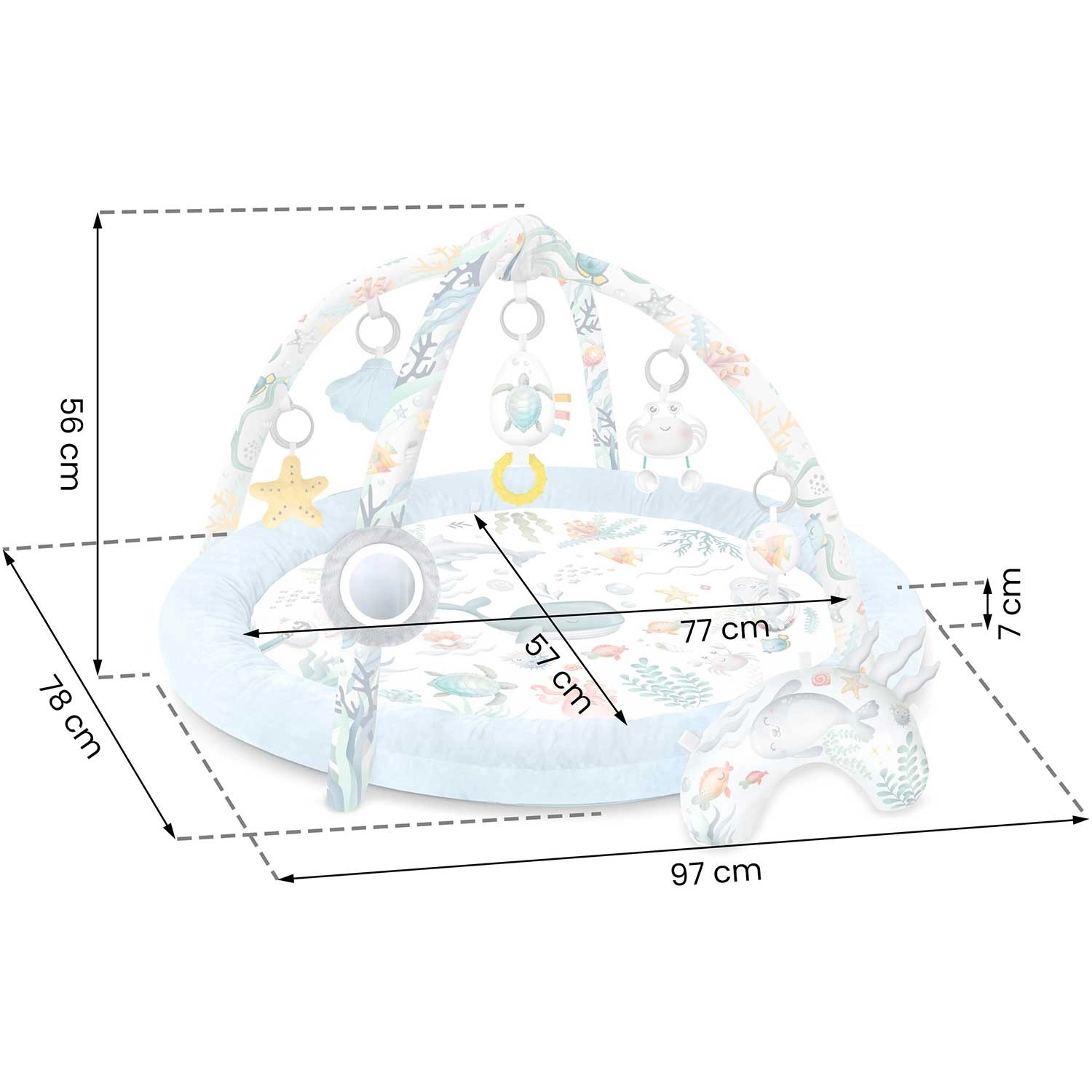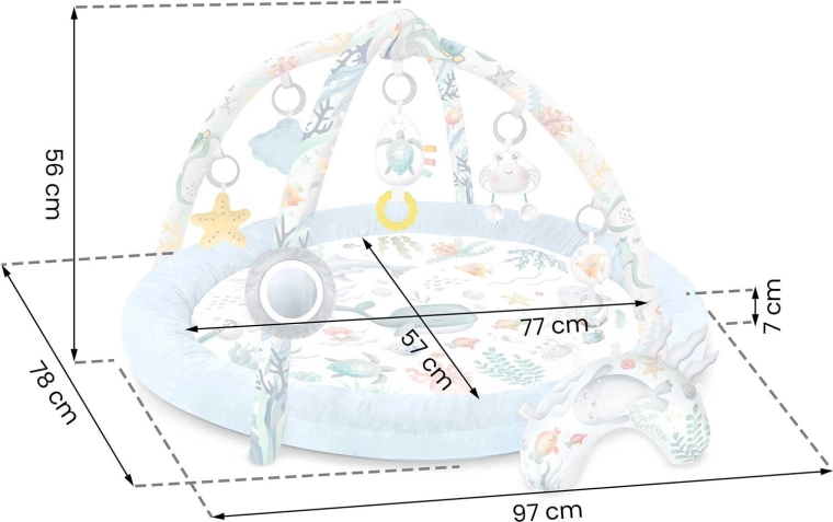 - Hracia deka so zvýšeným okrajom, 2 odnímateľné oblúky, 7 multifunkčných hračiek, vankúšik
