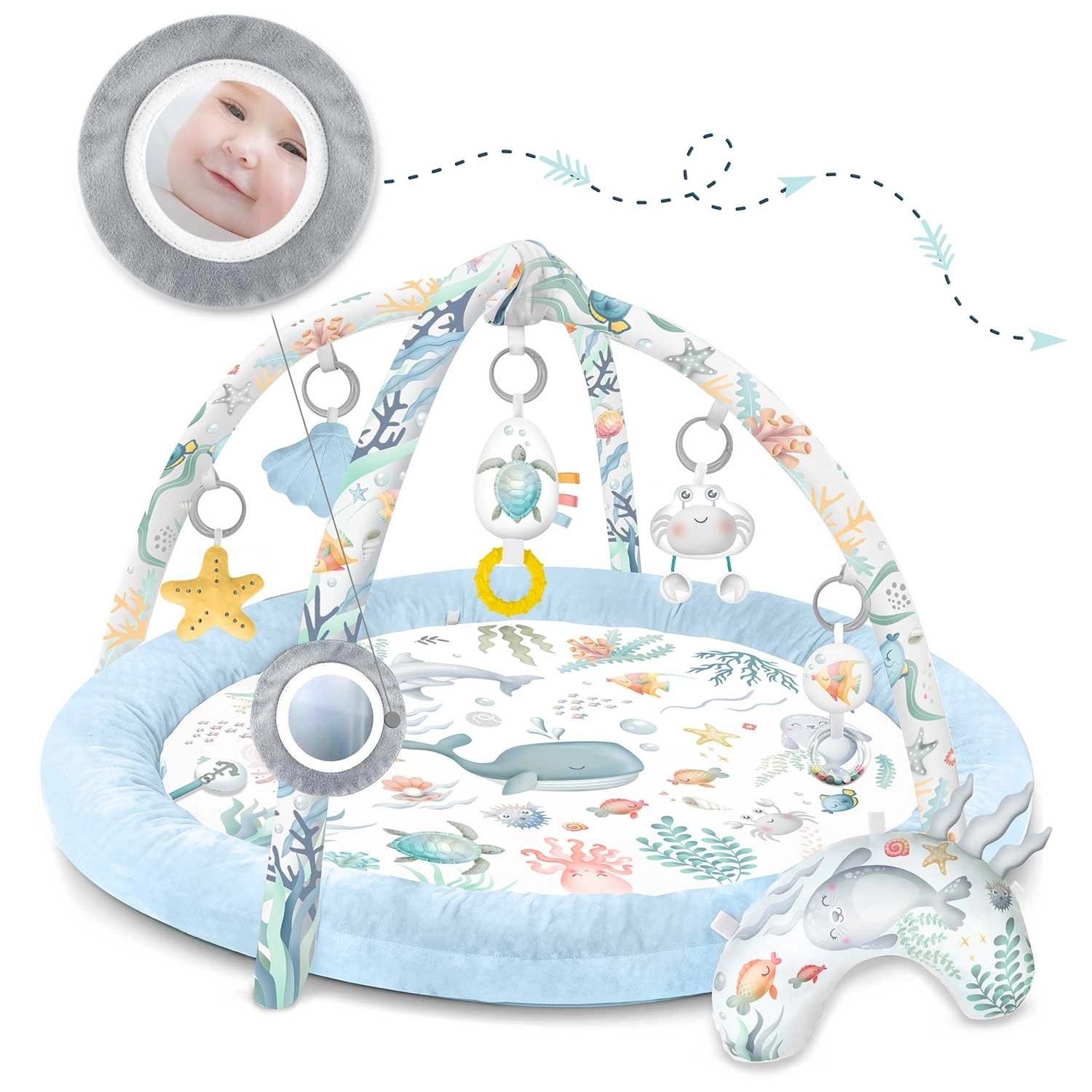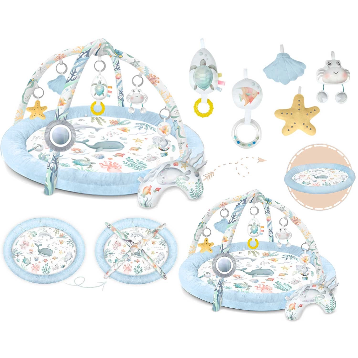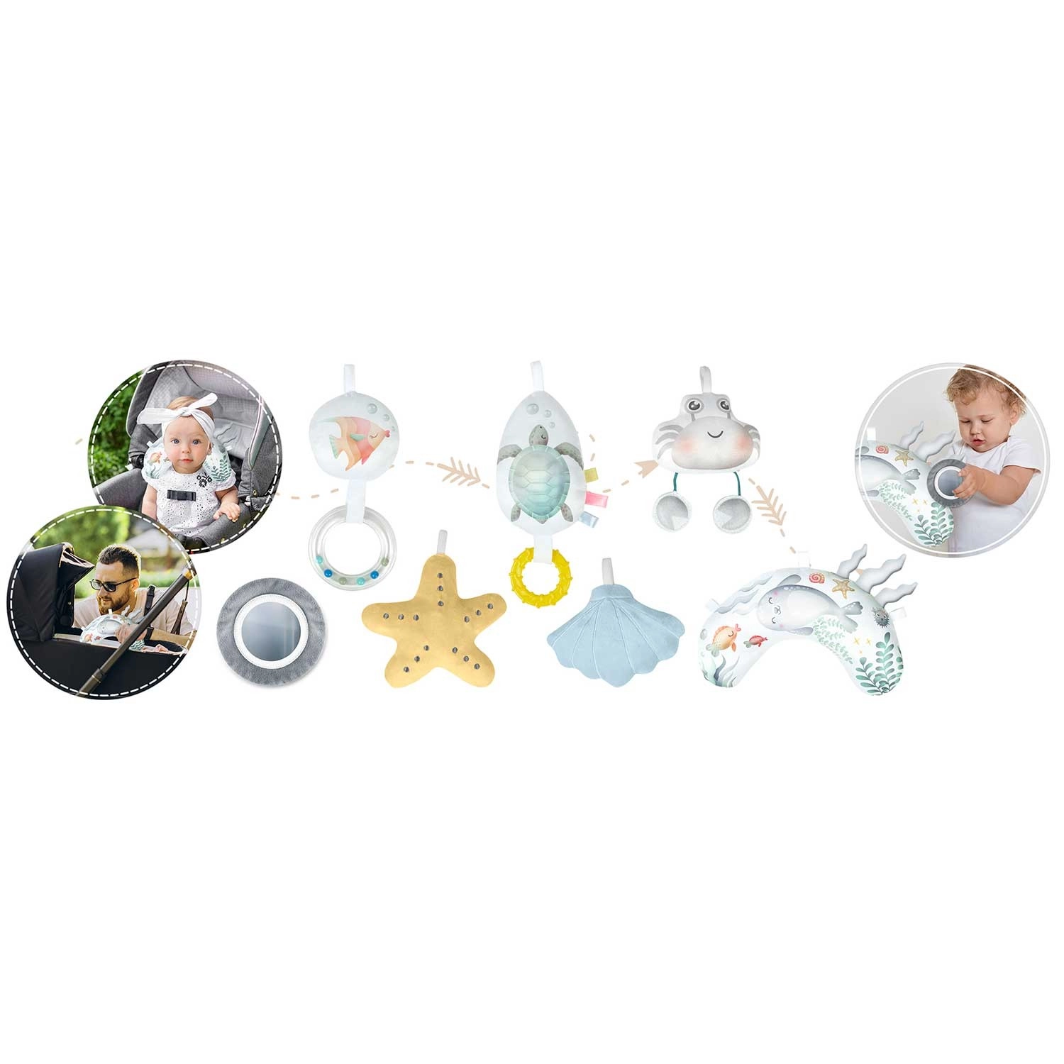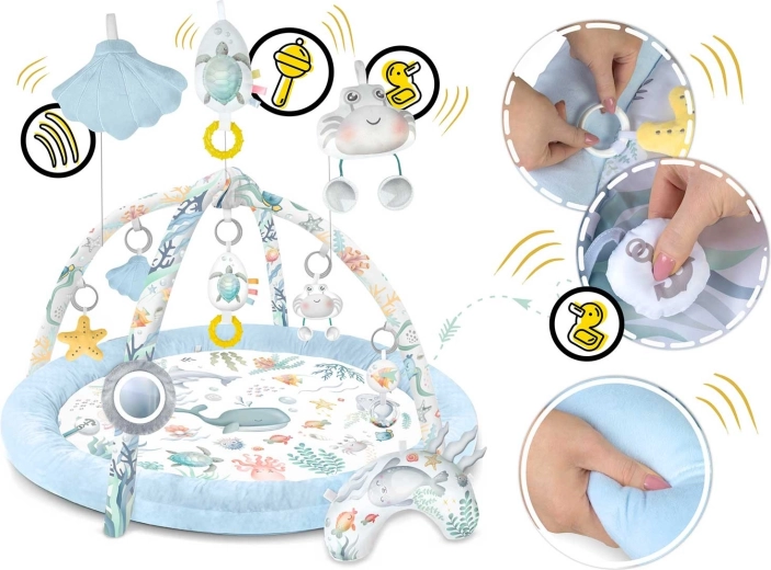 Zrkadielko, hrkálky, mäkké plyšové postavičky a pískajúci krab podporujú zrak, sluch aj hmat. Hračky možno ľubovoľne presúvať na oblúkoch aj na okrajoch.