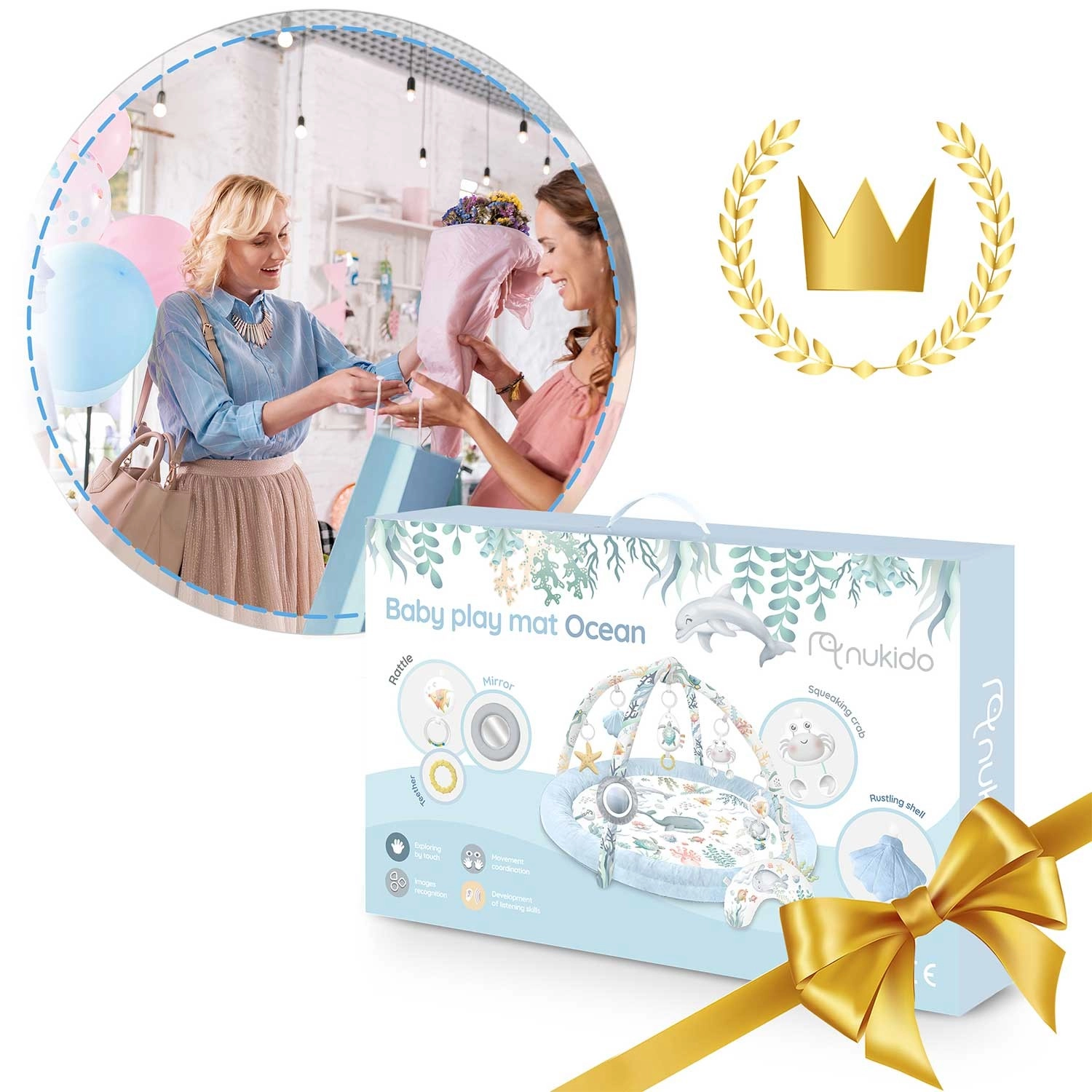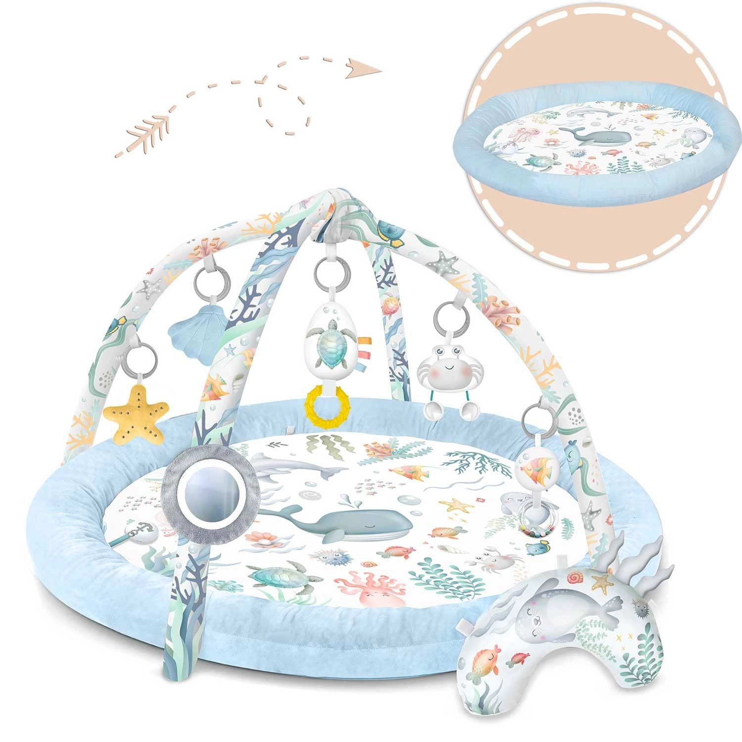 Interaktívna hracia deka Nukido Ocean ponúka deťom bezpečné a pohodlné miesto na hru aj oddych. Obsahuje 2 odnímateľné oblúky, 7 multifunkčných hračiek vrátane zrkadielka, hrkálok a pískatka, a tiež mäkučký vankúšik na čas na brušku. Ľahko sa skladá, má mäkký, ľahko čistiteľný povrch a stimulačnú oceánsku farebnosť na podporu zmyslového a motorického vývinu bábätka.