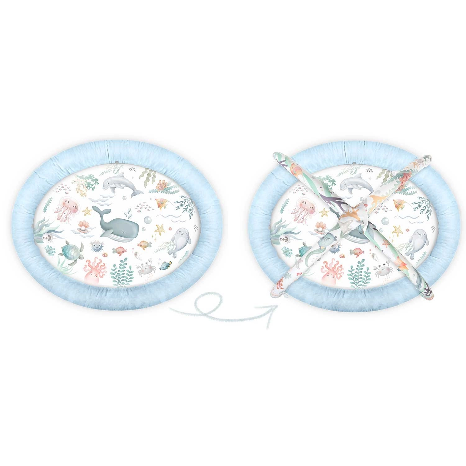 Oblúky možno rýchlo odopnúť a deku zložiť. Získate útulný kokon pre novorodenca aj priestrannú podložku pre batoľa – vždy s mäkkým, ľahko čistiteľným povrchom.