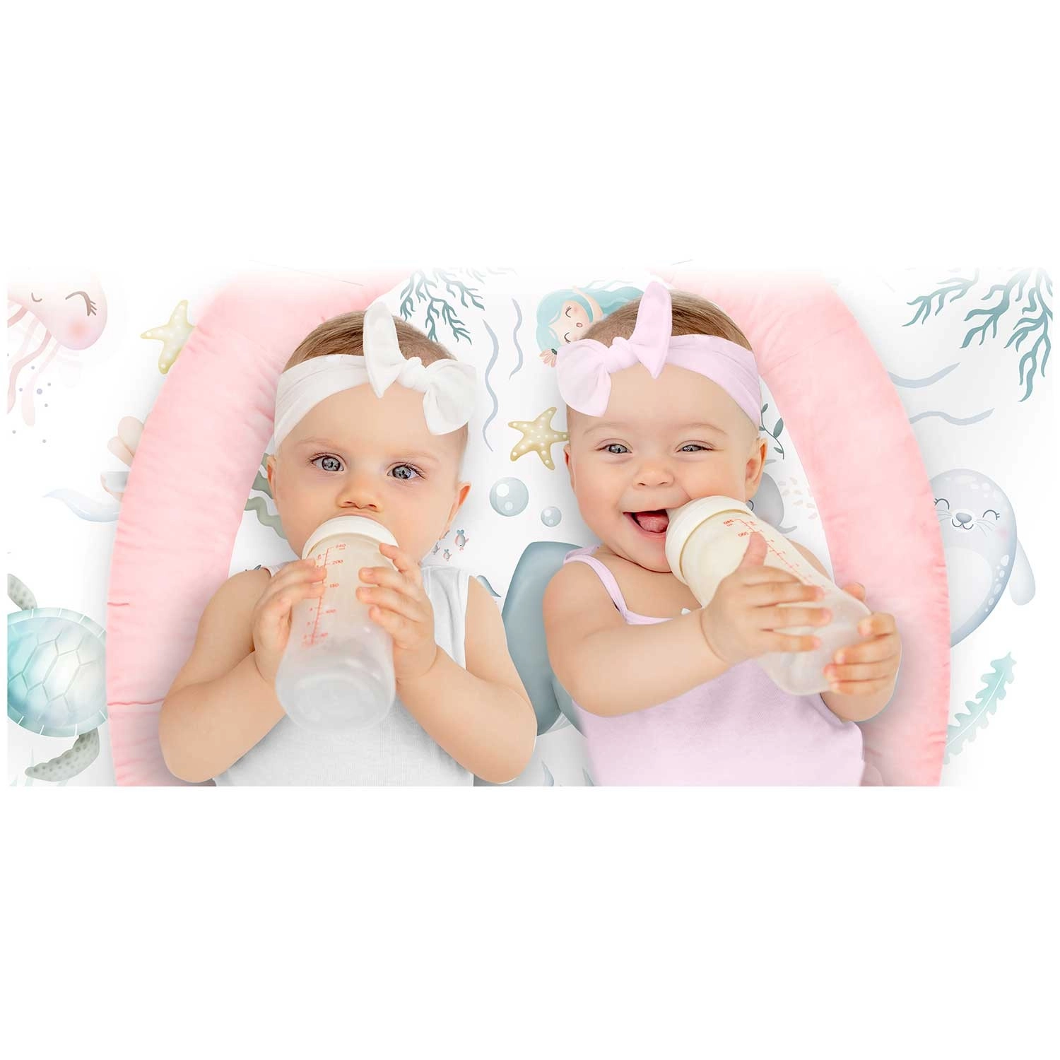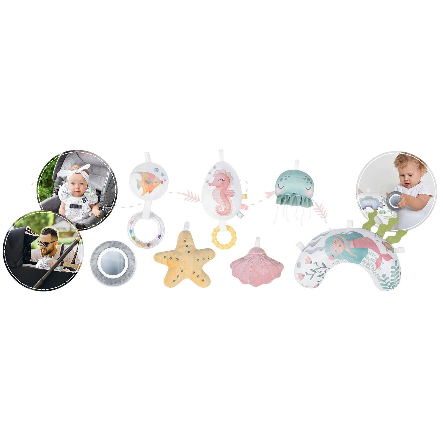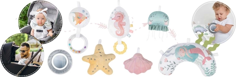 Zrkadielko, hviezdica, mušle, medúzka, morský koník a ďalšie prvky s hrkajúcimi a šuštiacimi efektmi podnecujú zvedavosť, koordináciu oko–ruka a prvé úchopy.