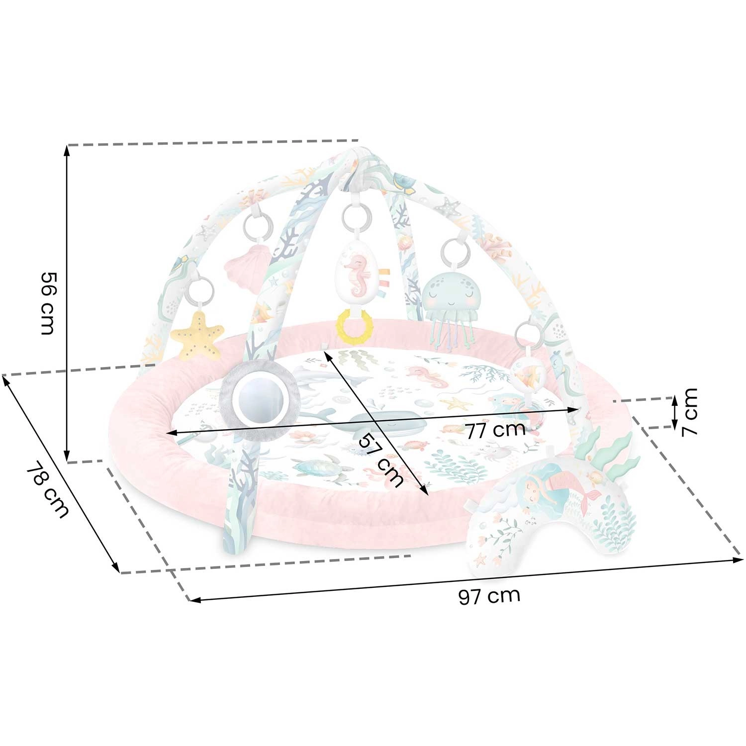 Hracia deka, vstavaný mantinel/otúľovač, 2 odnímateľné oblúky, 7 multifunkčných hračiek