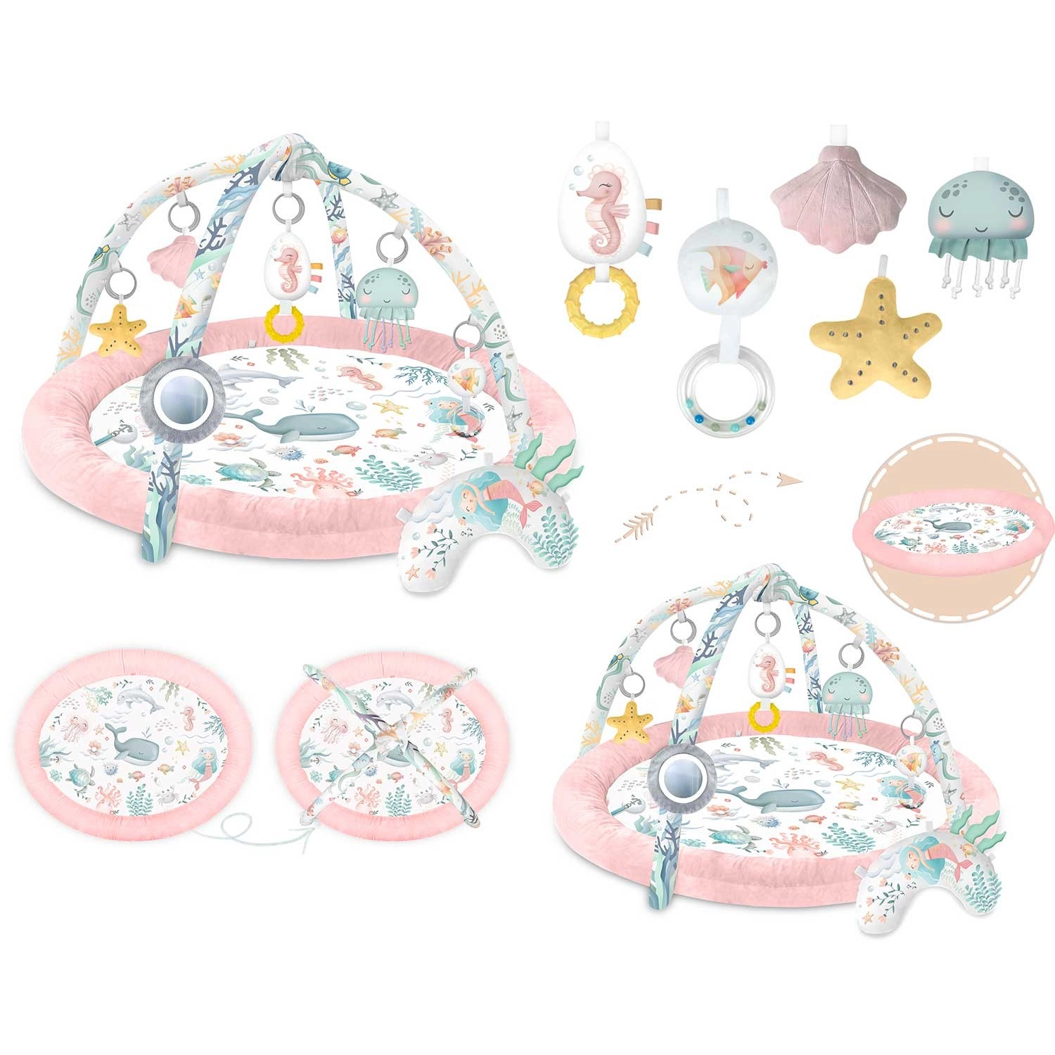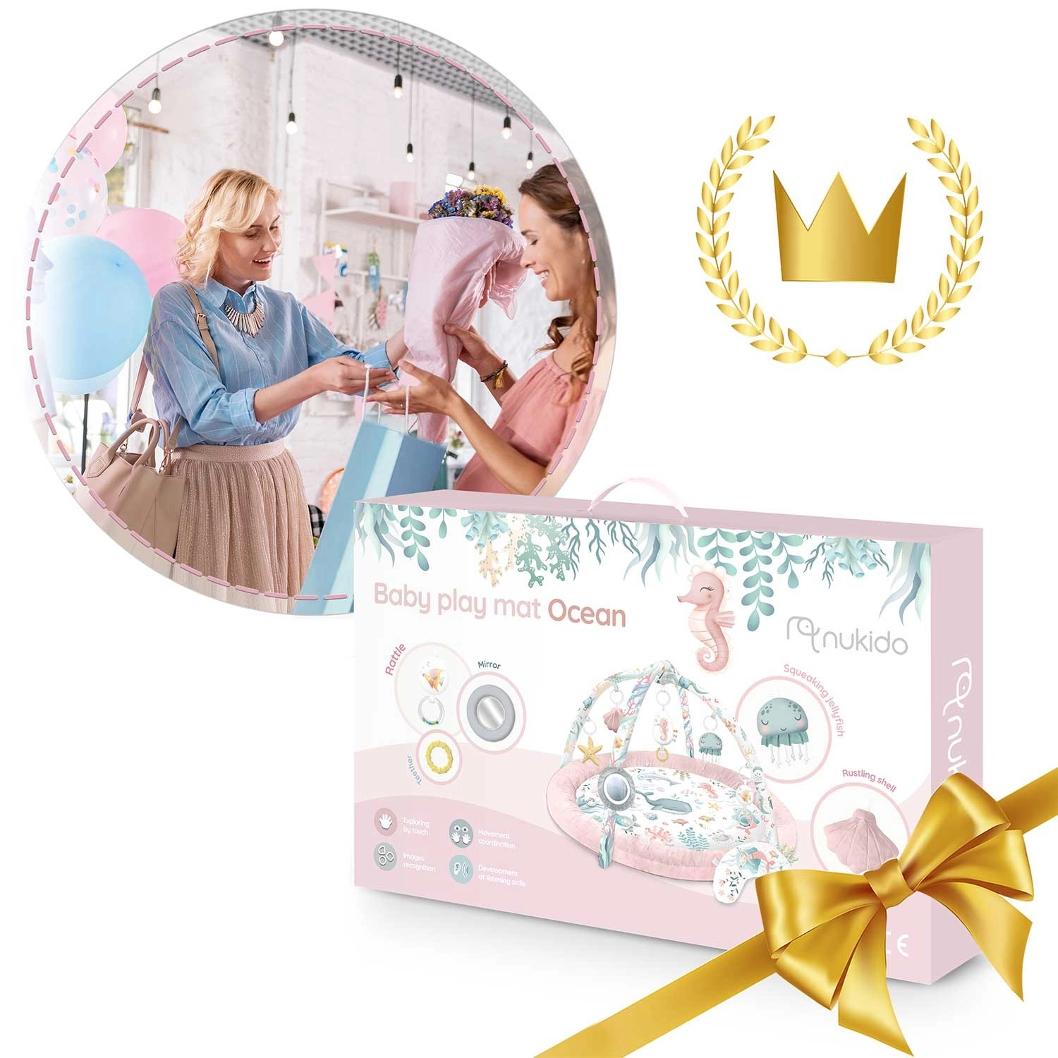 Objavte mäkučkú a bezpečnú hraciu deku pre bábätká Nukido Ocean v ružovom prevedení, ktorá kombinuje rozvoj zmyslov, podporu koordinácie a pohodlie pri tummy time. Dva odnímateľné oblúky so 7 multifunkčnými hračkami (zrkadielko, pískatko, hrkálky a šuštivé prvky) motivujú k uchopovaniu a skúmaniu. Jednoduché skladanie, mäkký a umývateľný materiál a podporný vankúšik robia z tejto deky ideálne centrum aktivít od prvých mesiacov.