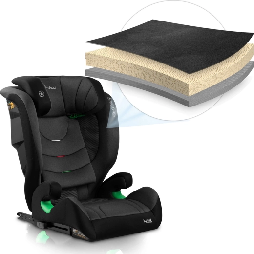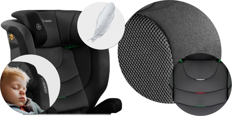 Bočná ochrana SIP a materiály s bočným bufferom efektívne pohlcujú energiu pri náraze. Priedušné a mäkké čalúnenie s hustou penou a tvarovaným EPS jadrom zvyšujú komfort aj na dlhších cestách. Poťah možno jednoducho zložiť a vyprať, takže sedačka zostane čistá a svieža.