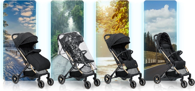 - Komfort v každom počasí: strieška proti UV a dažďu, v balení pláštenka a nánožník.