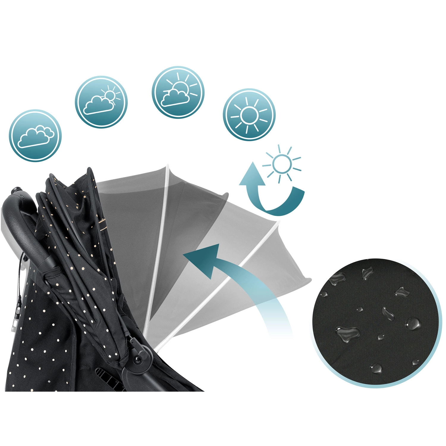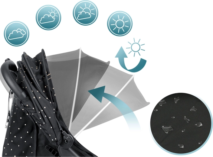 Strieška s viacerými polohami chráni dieťa pred slnkom, vetrom aj ľahkým dažďom. Vodeodpudivá úprava materiálu uľahčuje údržbu a zaisťuje komfort v každom ročnom období.