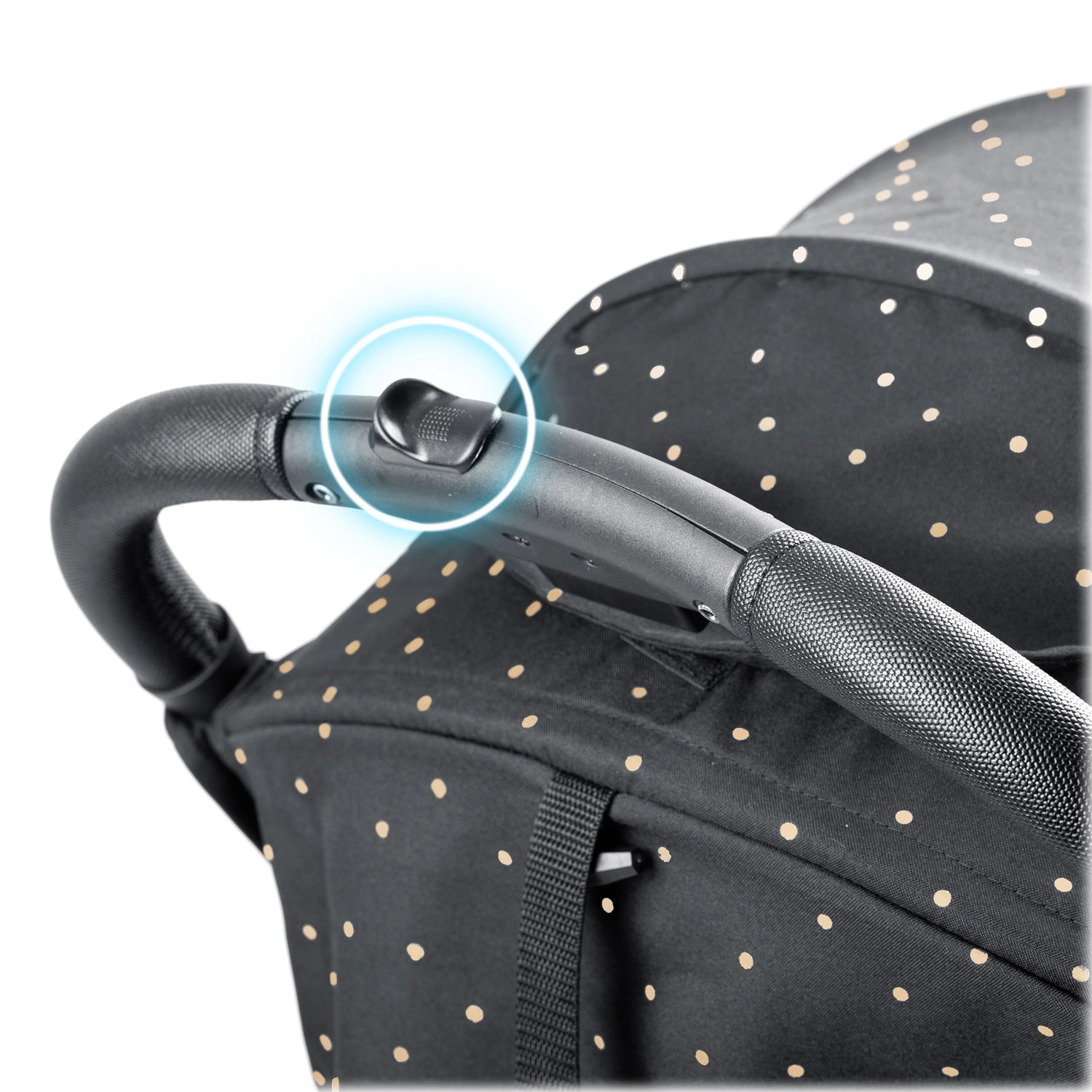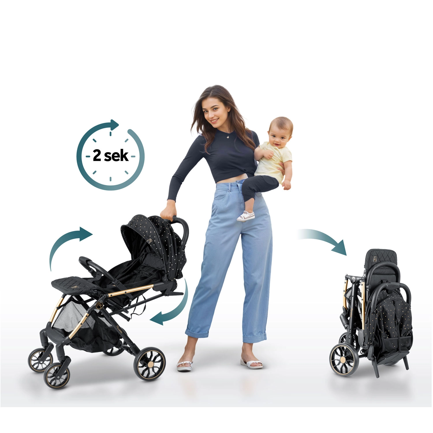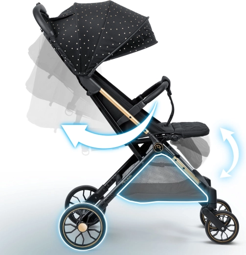 Pre maximálne pohodlie dieťaťa je tu plynule polohovateľná opierka chrbta až do ľahu, nastaviteľná opierka nôh s odolným PU povrchom a rozšíriteľná strieška s ochranou pred slnkom, vetrom aj ľahkým dažďom. Samozrejmosťou je päťbodový pás s polstrovaním, odnímateľné madlo a priestranný kôš na všetko, čo potrebujete na cestách.