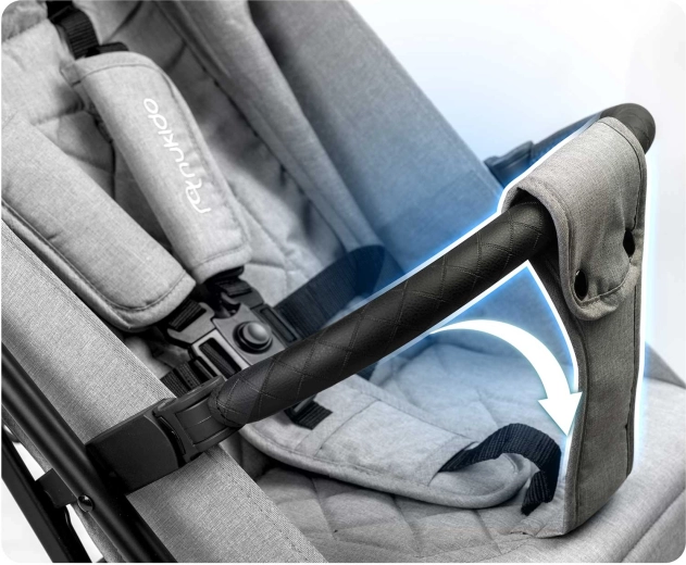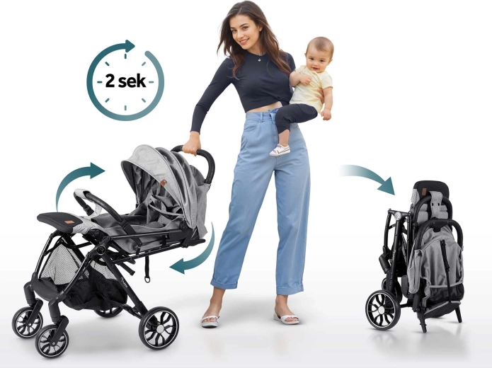 Intuitívne tlačidlo umožní zložiť kočík rýchlo a bezpečne – ideálne do MHD, do auta aj k bráne lietadla. Po zložení je kompaktný a ľahko prenosný.