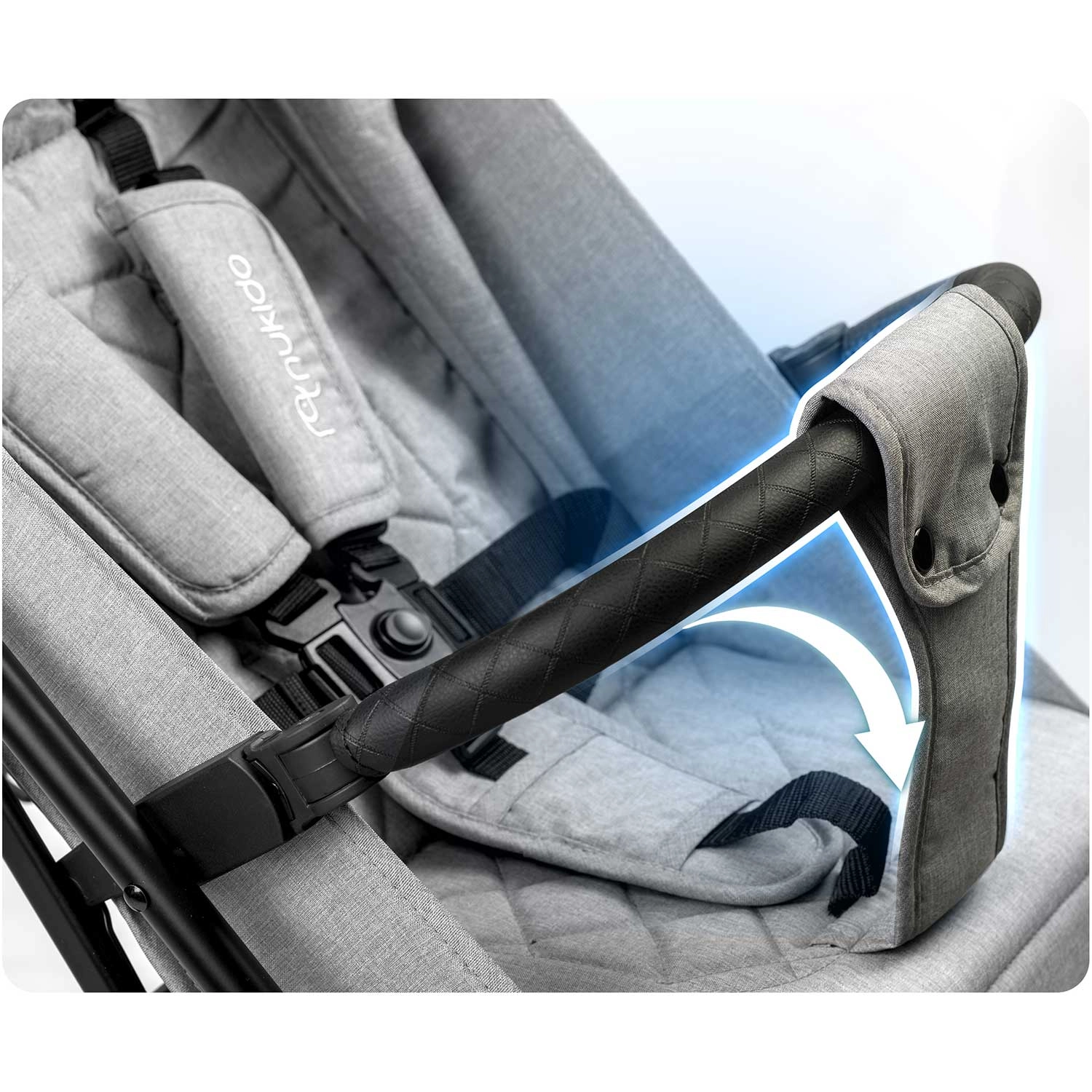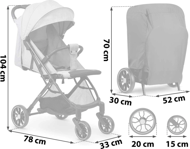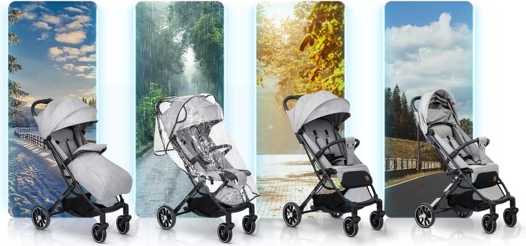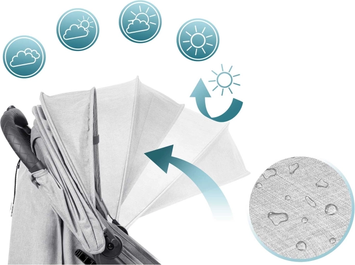 Praktická výbava zahŕňa priestranný kôš pod sedadlom, odnímateľné madlo pre jednoduché usadenie dieťaťa, pláštenku a nánožník v balení a bezpečné, mäkké textílie príjemné na dotyk. Veľká strieška s možnosťou rozšírenia chráni pred slnkom, vetrom aj ľahkým dažďom a prispôsobí sa tomu, či dieťa spí, alebo sleduje svet okolo.