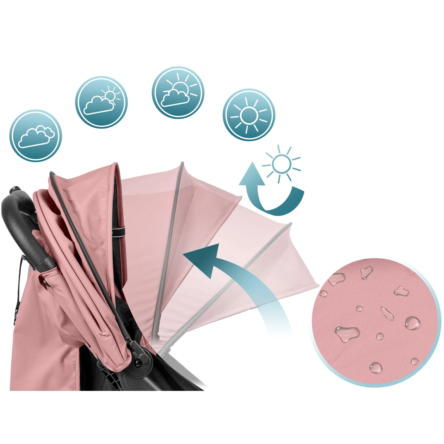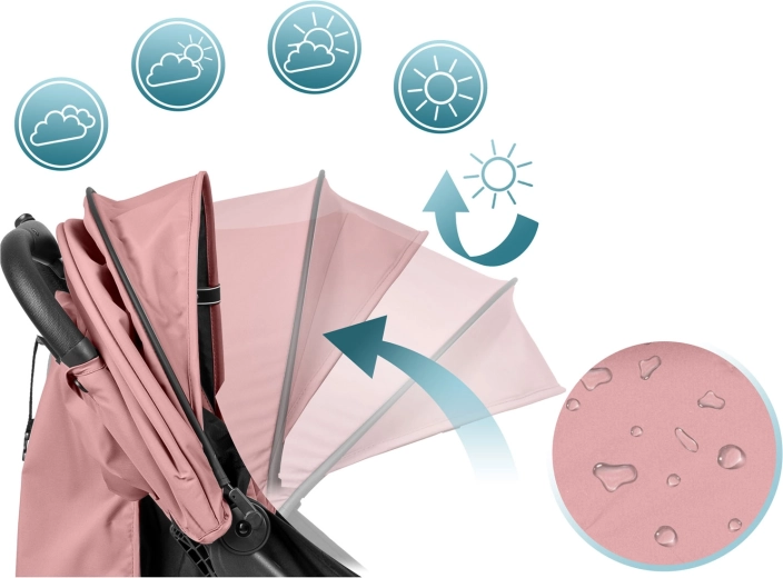 Rozšíriteľná strieška s UV ochranou a vodoodpudivou úpravou chráni pred slnkom, vetrom aj ľahkým dažďom. Pláštenka je súčasťou balenia.