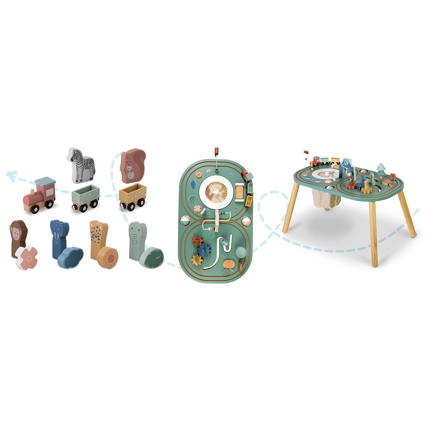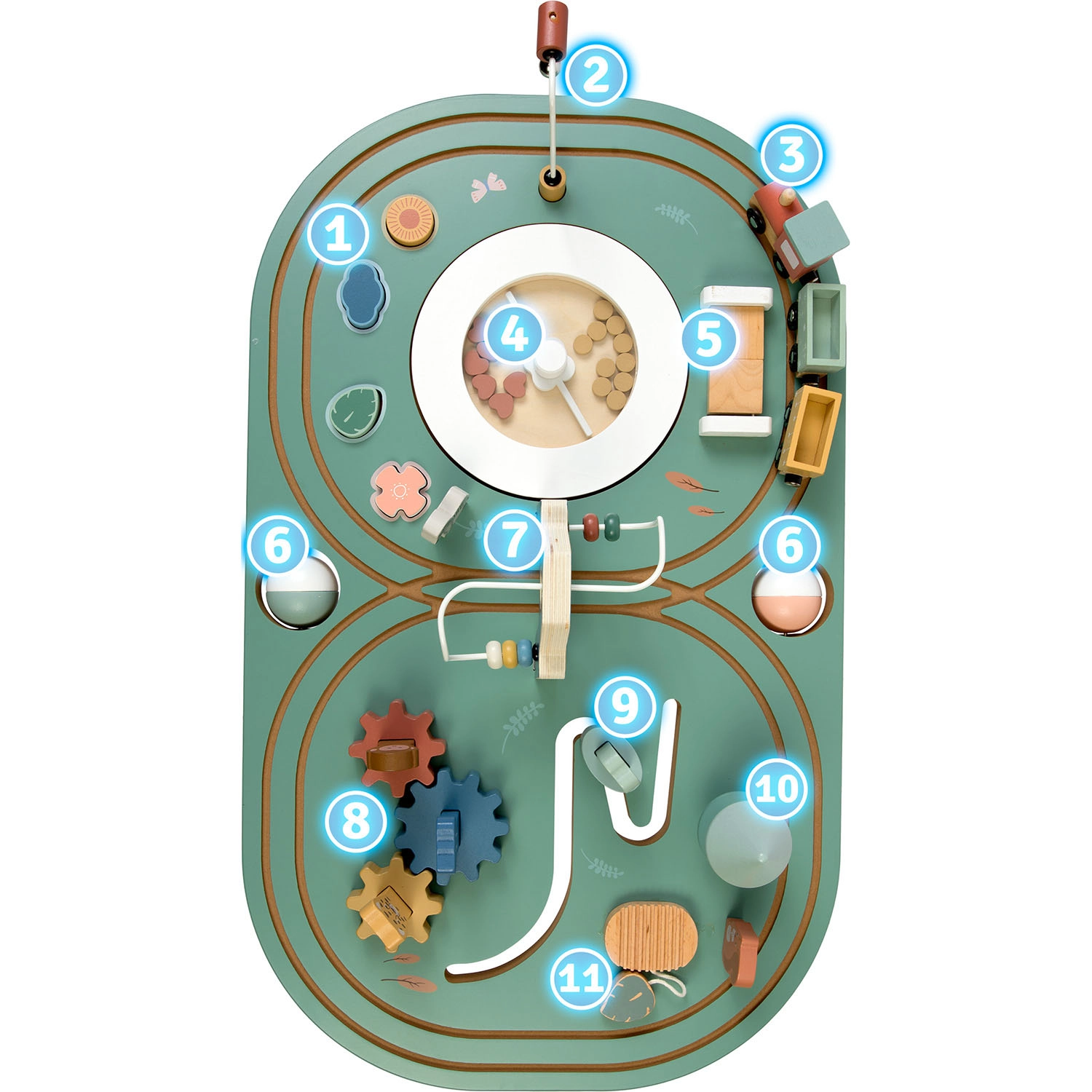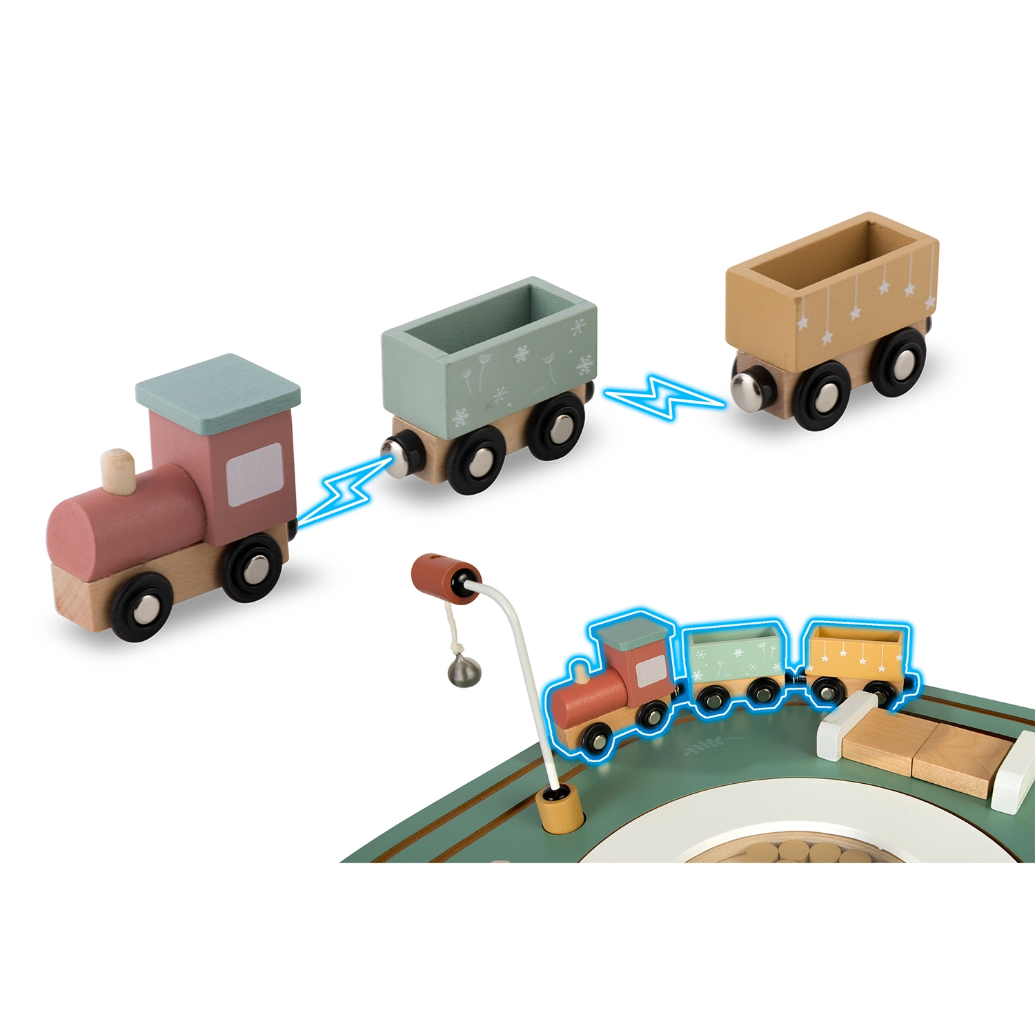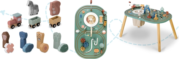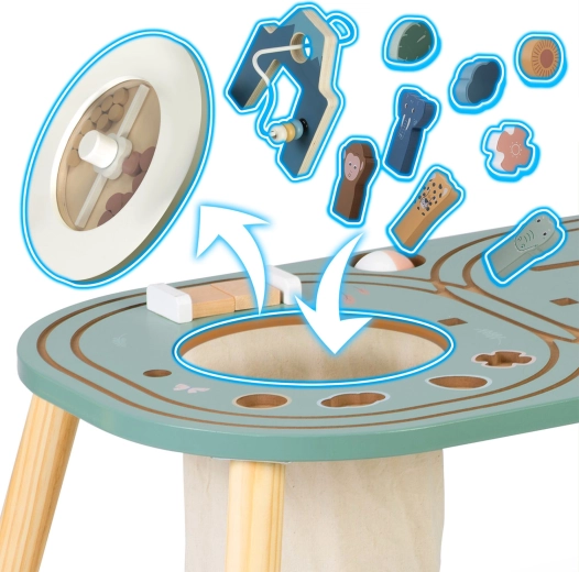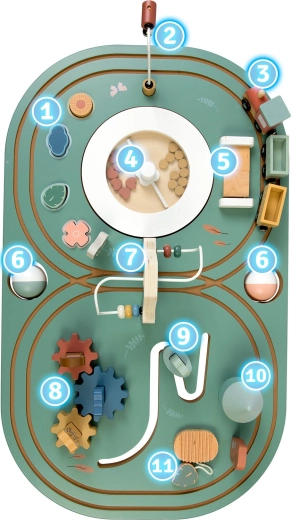 - Multifunkčné centrum: vláčik na magnet, guľodrom, ozubené kolá, labyrinty, zvonček a triediace kocky.
