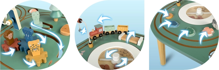 Detský zmyslový stolík NUKIDO spája zábavu a vzdelávanie v jednom. Na priestrannej hracej ploche deti nájdu magnetickú vláčikodráhu s mašinkou a vagónikmi, guľodrom pre guličky, rotujúci mlynček, ozubené kolá, korálkový labyrint, triedenie tvarov a ďalšie chytré aktivity. Každý prvok rozvíja koordináciu ruka-oko, logické myslenie, plánovanie pohybu a trpezlivosť.