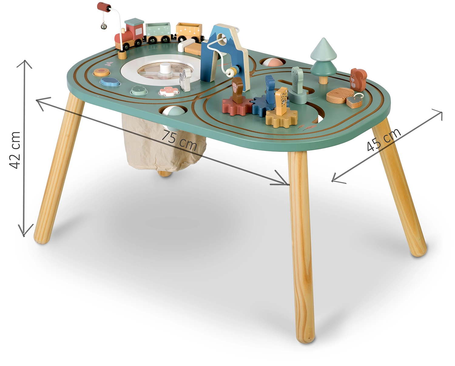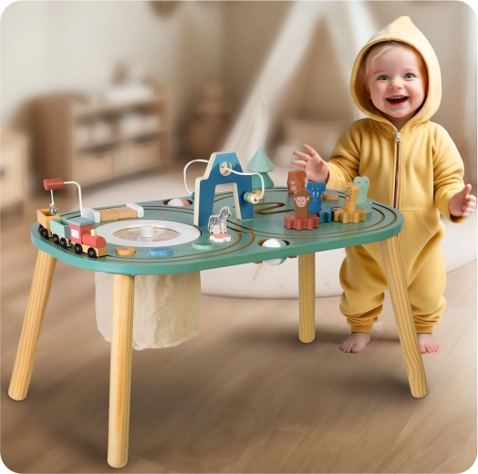 Objavte univerzálny drevený aktivizačný stolík NUKIDO s vláčikom, guľodromom, labyrintmi a prevodmi, ktorý podporuje jemnú motoriku, zmyslové vnímanie a učenie hrou podľa princípov Montessori. Vyrobený z kvalitného dreva a natretý bezpečnými farbami, ponúka dlhú životnosť, elegantný dizajn a praktický textilný vak na ukladanie dielikov priamo pod doskou stola.