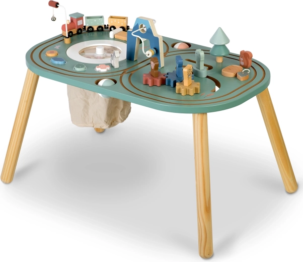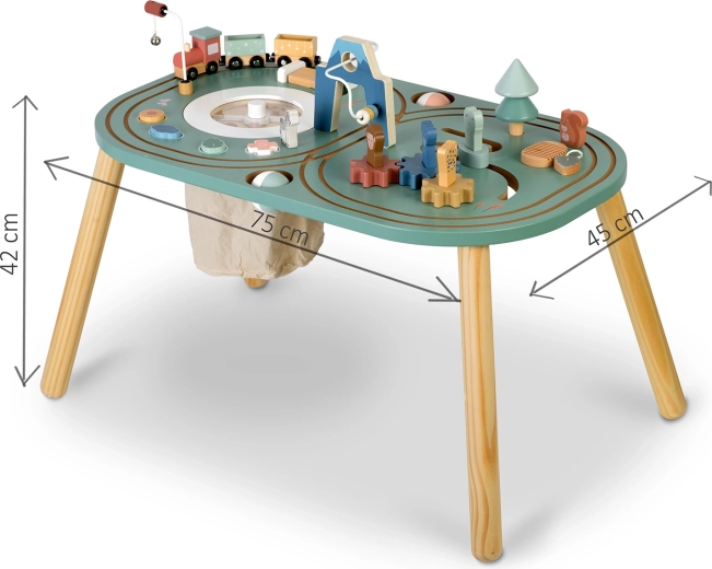 Stolík je vyrobený z prírodného dreva s hladkými, zaoblenými hranami a povrchovo upravený bezpečnými, nezávadnými farbami. Minimalistický vzhľad v tlmených farbách sa hodí do moderného interiéru a vďaka stabilnej konštrukcii odolá každodenným hrám. Praktický tkaný vak pod doskou pomáha udržať poriadok – po hre stačí všetko jednoducho schovať.